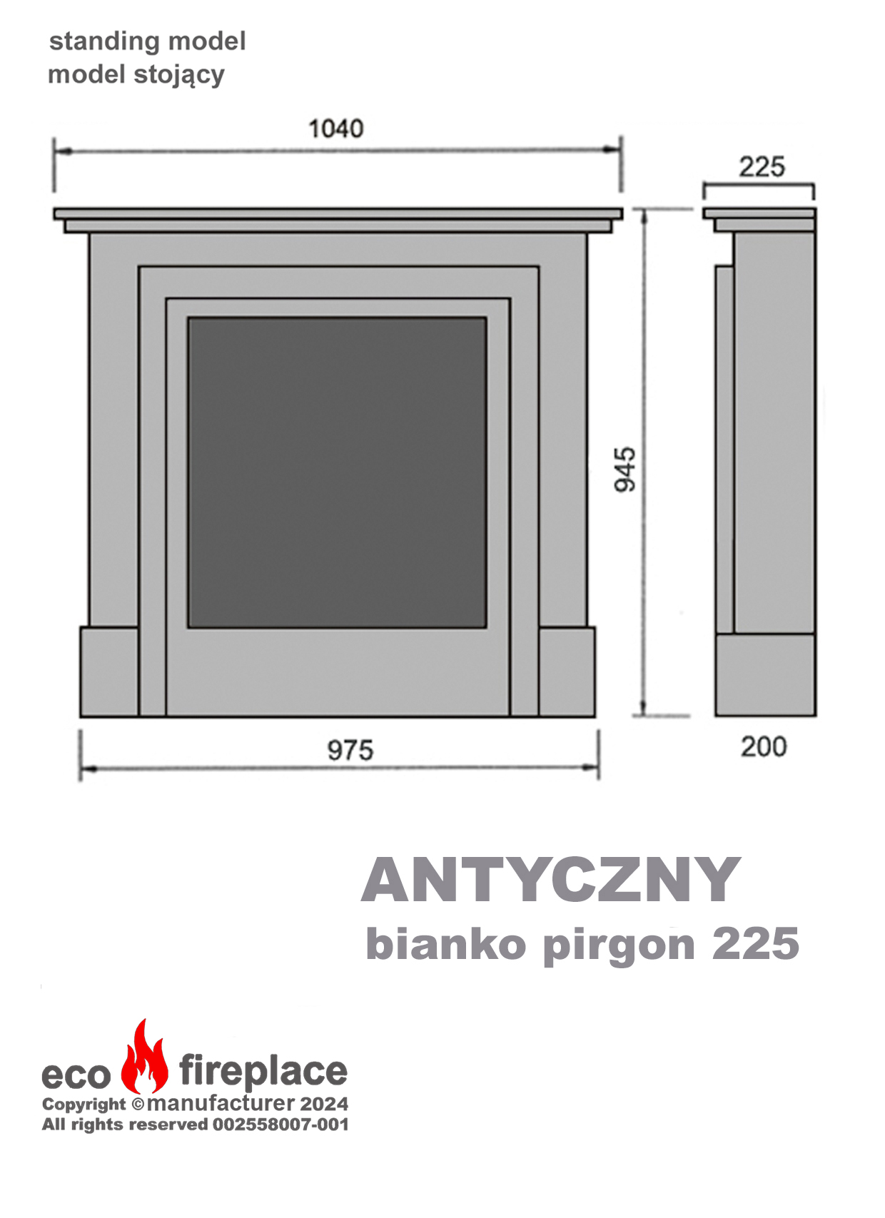 - Model Antyczny 225 jest wysposażony we wkład na biopaliwo o wymiarach 450 x 95 x 75 mm typu FALA lub LINIA (czarny albo inox)