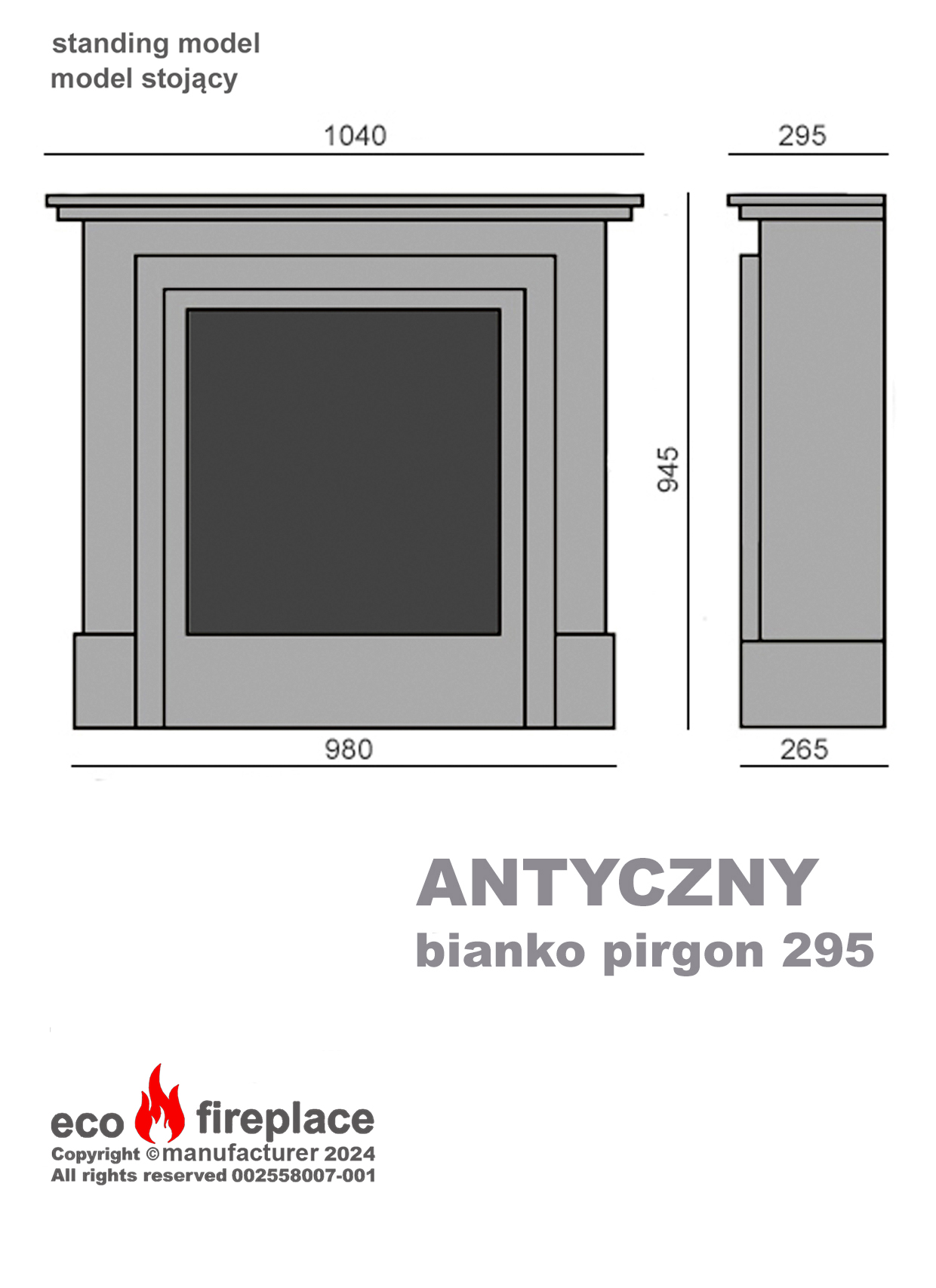 - Model Antyczny 295 jest wysposażony we wkład na biopaliwo o wymiarach 370 x 160 x 72 mm typu FALA lub LINIA