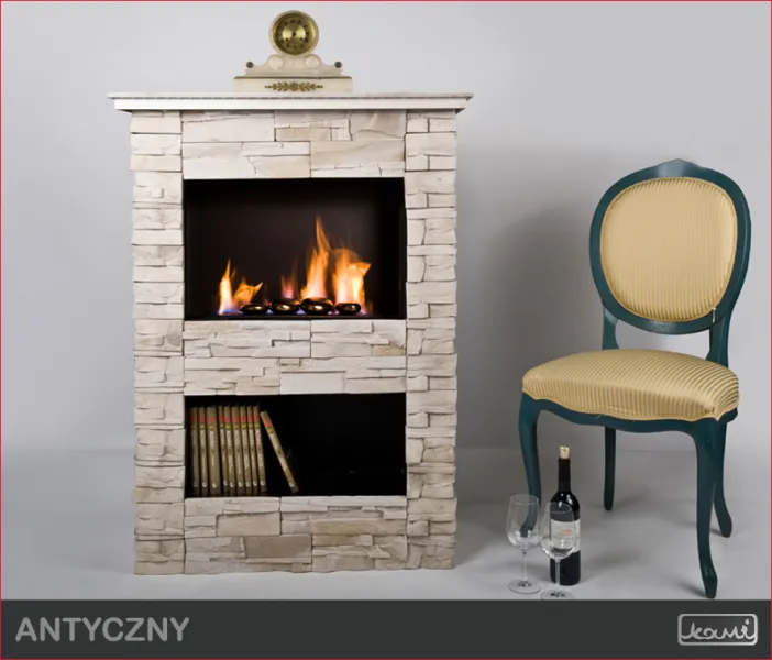 To klasyczny kominek portalowy wykonany w całości wykonany ze szlachetnego kamienia naturalnego – kamień dekoracyjny roma, którego zarówno kolor jak i konstrukcja pasują do większości wnętrz. Dobudowana dodatkowo półka pozwala na rozszerzenie walorów estetycznych tego modelu biokominka według własnych preferencji. Konstrukcję biokominka stanowi stelaż, do którego przymocowane są płytki kamienia dekoracyjnego.