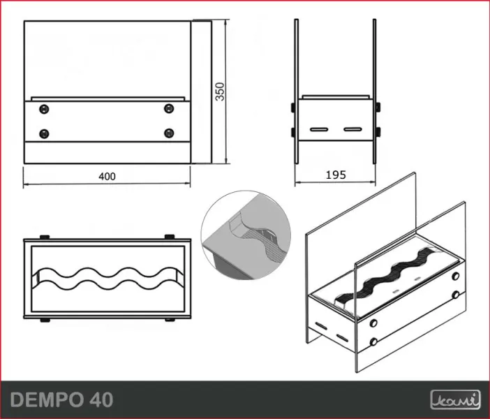 Biokominek DEMPO 40 wysyłamy w zestawie do samodzielnego montażu, który jest niezwykle łatwy: do obudowy należy zamocować szyby za pomocą dołączonych w zestawie wkrętek ze stali nierdzewnej.
