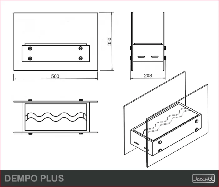 Biokominek DEMPO 50 wysyłamy w zestawie do samodzielnego montażu, który jest niezwykle łatwy: do obudowy należy zamocować szyby za pomocą dołączonych w zestawie wkrętek ze stali nierdzewnej.