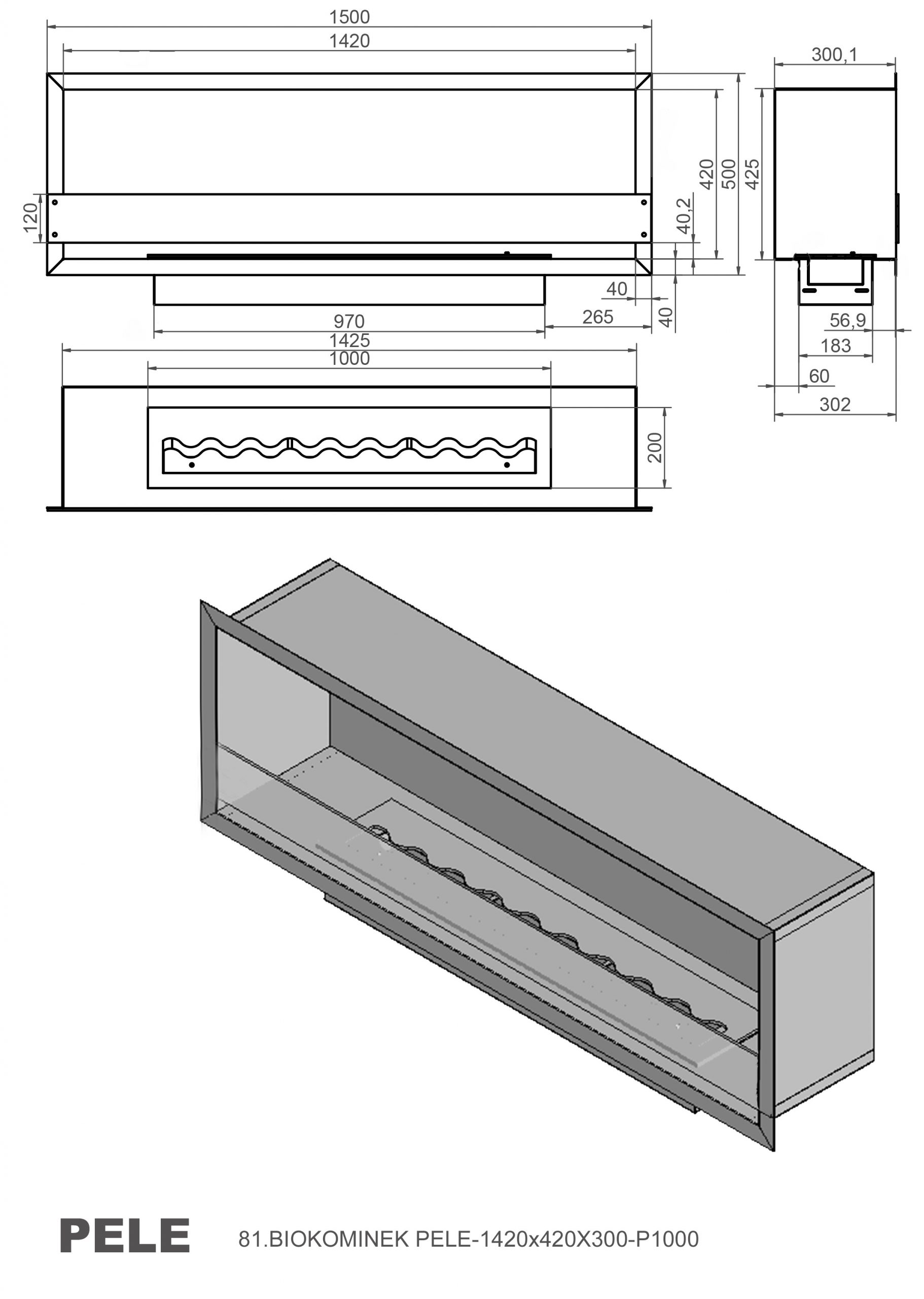 Biokominek Pele 1420x420x300-P1000 jest wyszukanym i oryginalnym modelem kominka do zabudowy na bioetanol.
