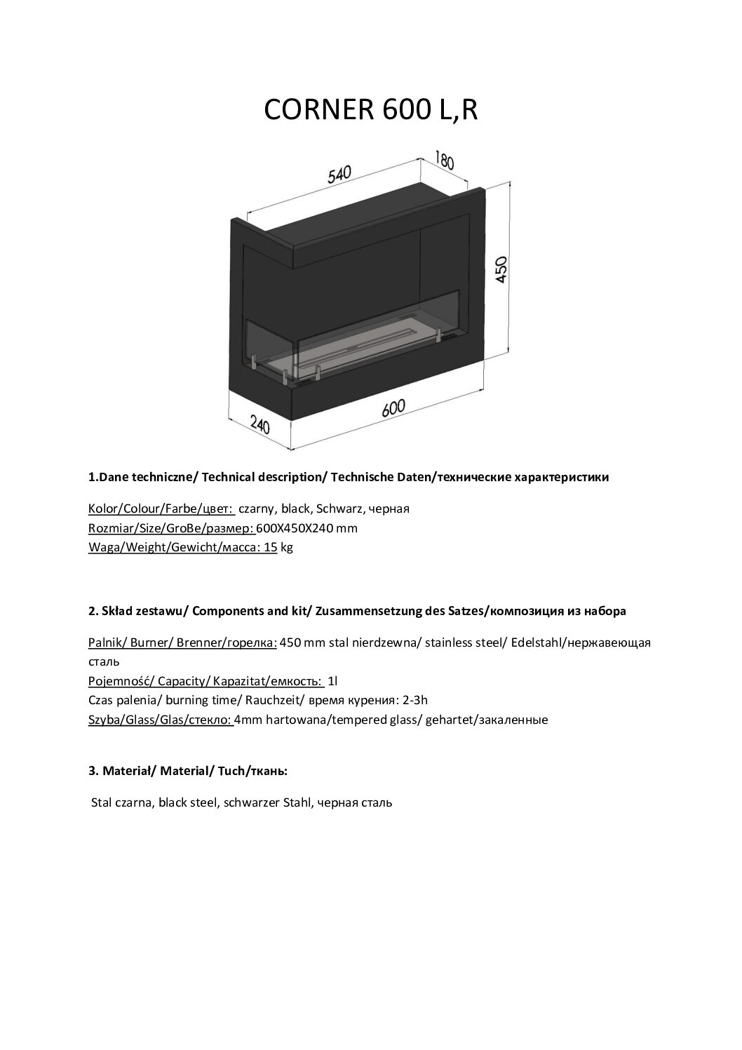 Biokominek Corner 600 L to wkład narożny z otwartą lewą stroną i przeznaczony do zamontowania w przygotowanej wnęce. Model ten to nowoczesny i uproszczony kominek dobry jakościowo oraz spełniający normy bezpieczeństwa. Jego konstrukcja zapewnia szybki i nieskomplikowany montaż, zaś prosta forma odnajdzie się w każdym wnętrzu nowoczesnym i klasycznym.