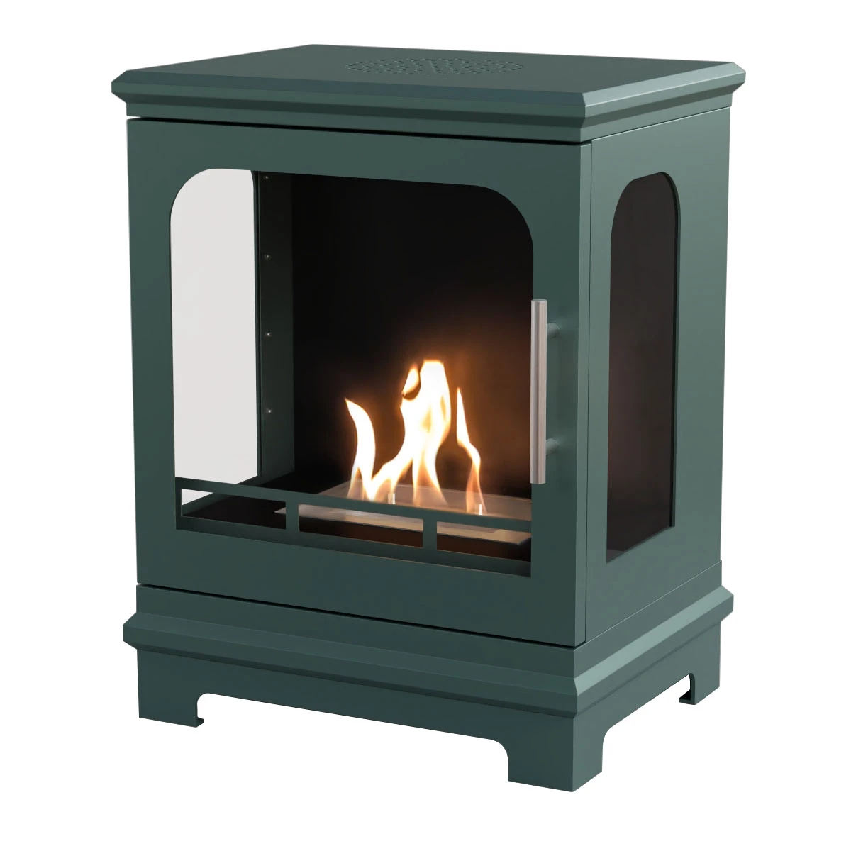 Biokominek Honolulu Ciemny zielony to kompaktowy, wolnostojący biokominek, zaprojektowany na wzór klasycznego pieca opalanego drewnem firmy ScandiFlames. Wykonany z malowanej proszkowo stali z eleganckim, czarnym wykończeniem, dzięki niewielkim rozmiarom idealnie pasuje do tradycyjnych palenisk kominkowych i obudów z zamkniętym przewodem kominowym.