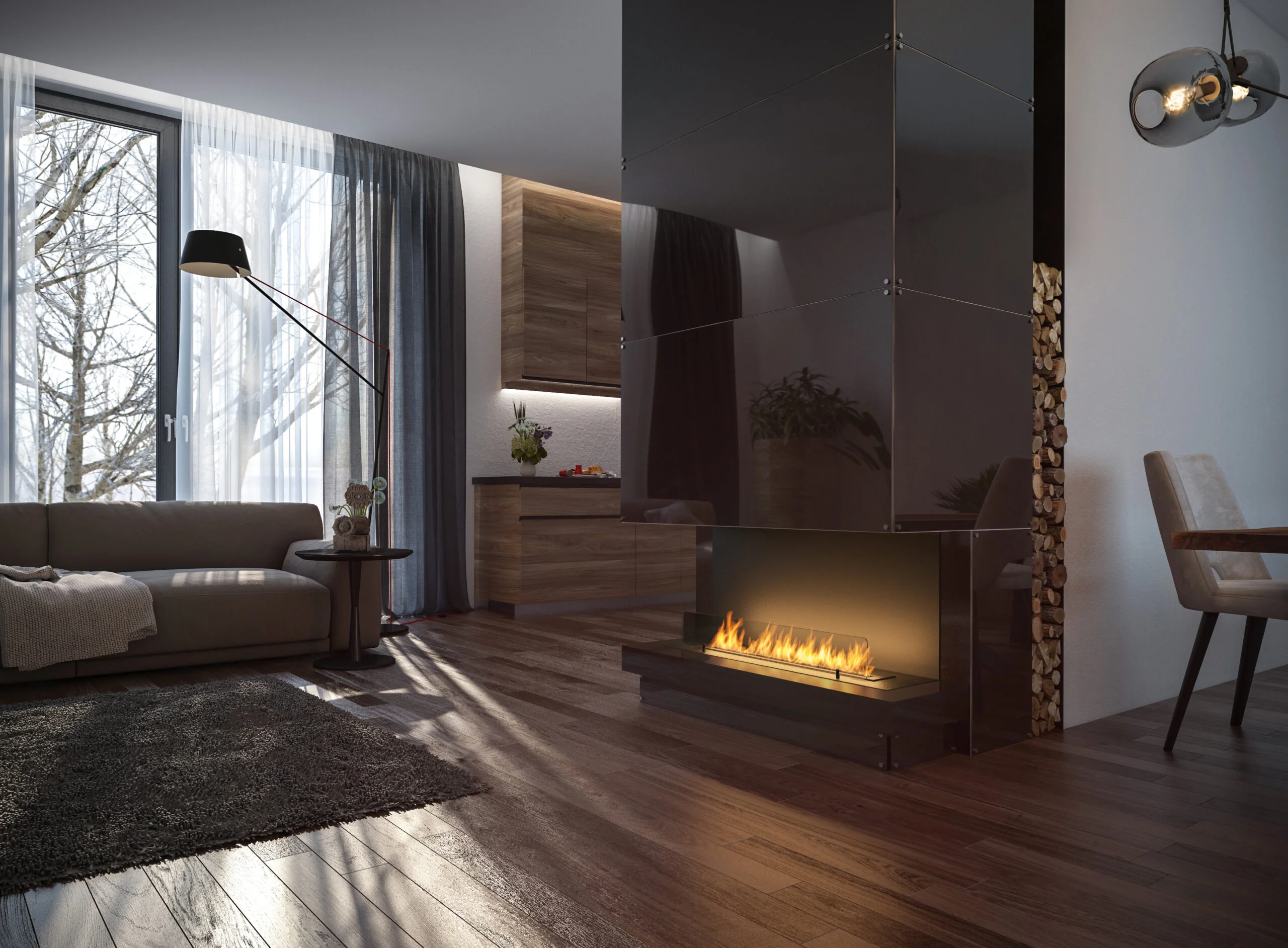 Biokominek wyposażony standardowo w palenisko 800 mm Proste LONG Fire z wkładem z włókna ceramicznego podnoszące bezpieczeństwo użytkowania i wydłużające czas palenia. Ponadto do kominka dołączona jest czarna nakładka maskująca. Daje one możliwość wyboru czy wnęka kominka ma być jednolicie czarna czy srebrny palnik ma być widoczny (w galerii załączamy zdjęcia wnętrza kominka z nałożoną nakładką oraz bez z widocznym palnikiem). Dodatkowo palnik osłonięty szyba ze szkła hartowanego. Długa, prosta linia ognia pięknie prezentuje się na tle czarnego wnętrza wkładu.