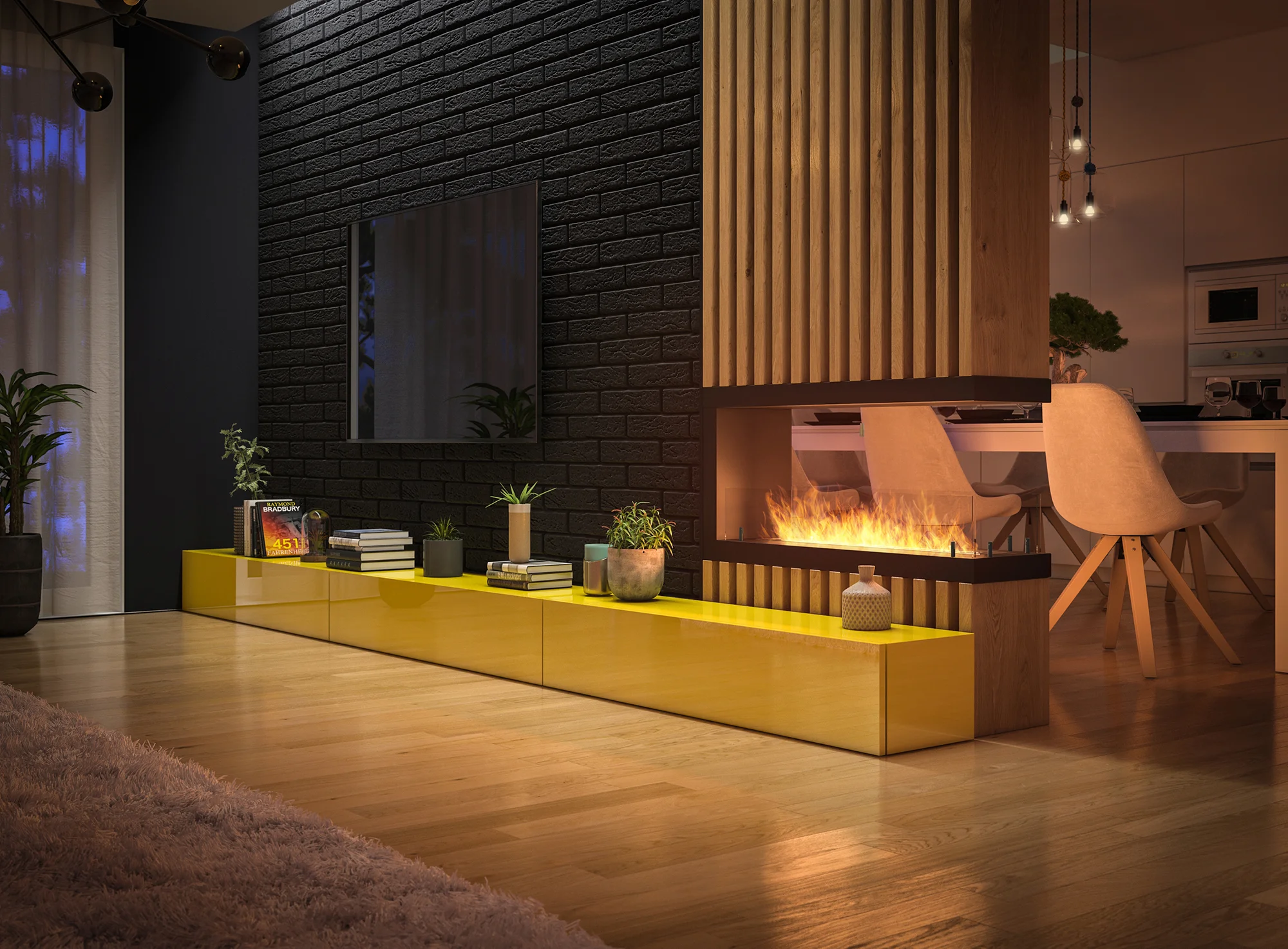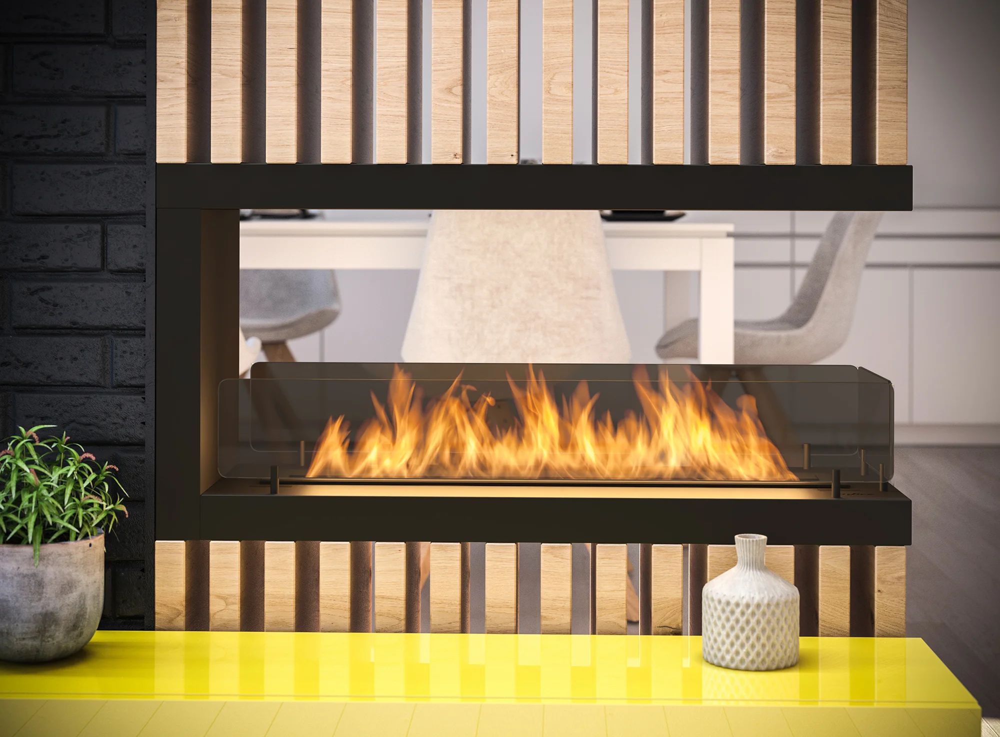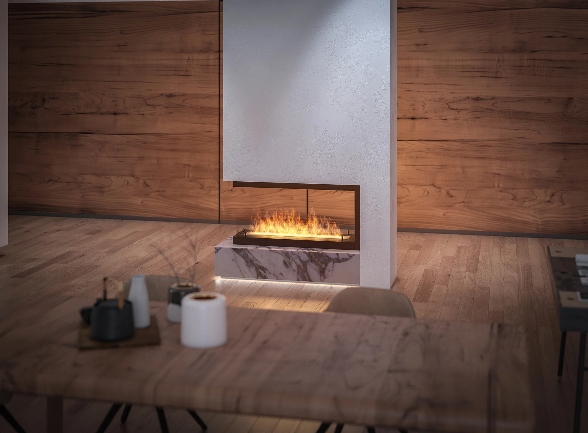 Wkład skonstruowany został w kształcie litery U czyli jest wkładem wyspowym i umożliwia obserwację ognia, aż z trzech stron. Ten biokominek stwarza wiele możliwości aranżacji, może być np. wbudowany w ścianę oddzielającą aneks kuchenny od salonu. Kominek może być pięknym i efektownym łącznikiem między dwoma pomieszczeniami.