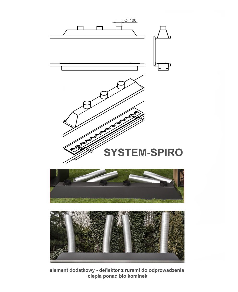 Konstrukcję modelu IZALKO 2510 x 530 x 299 Spiro stanowi szkielet (palenisko wraz z ramą) z blachy stalowej o gr. 1,5 mm, malowanej proszkowo czarną farbą termoodporną półmatową. Wewnątrz paleniska znajduje się komora, w której umieszczony jest wkład 1400 x 200 na biopaliwo. Wersja Spiro jest rozwiązaniem dla projektów przewidujących telewizor nad kominkiem. Umożliwia ona odprowadzenie wysokiej temperatury, która generuje palenisko.