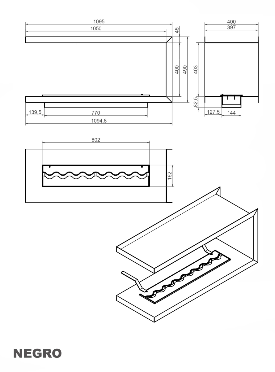 Biokominek Negro 1050x400x397-P800 oferujemy w zestawie z wkładem typu FALA. To wkłady z pokrywą precyzyjnie wyciętą w kształt sinusoidy (fali). Dzięki temu uzyskaliśmy niepowtarzalny efekt trójwymiarowości płonącego ognia, który w takiej wersji jest po prostu wyjątkowy! Regulacji wielkości płomienia dokonuje się za pomocą specjalnego uchwytu poprzez przesunięcie jednej z części pokrywy. Nie jest to zadanie trudne i nie wymaga wysiłku. Laserowo wycięty kształt blachy zapewnia idealne spasowanie obu części po zsunięciu ich do siebie w celu wygaszenia ognia. Ponadto dla większego bezpieczeństwa użytkowników wkładów KAMI w palnikach o długości pow. 600 mm stosujemy pokrywę domykaną „na zakładkę”, która gwarantuje błyskawiczne i pewne wygaszenie ognia w biokominku.