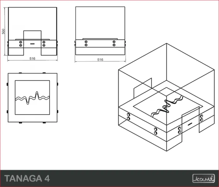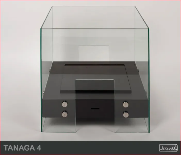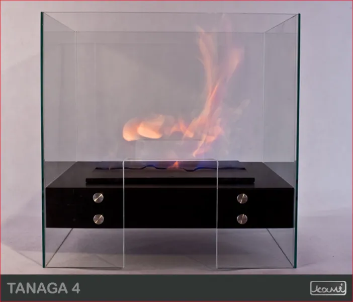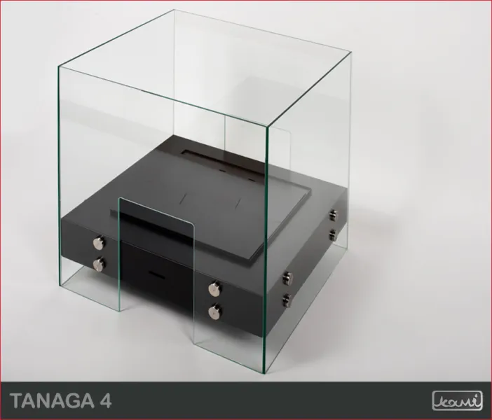 Biokominek Tanaga 4 oferuje wspaniałe efekty wizualne uzyskane poprzez wkład na biopaliwo z linia ognia o kształcie nieregularnej fali i symetrycznie zamontowane tafle hartowanego szkła. Tajemnicą niezwykłości tego biokominka jest jego minimalistyczny kształt sześcianu. Dostęp do wkładu w celu jego odpalenia, regulacji płomienia i wygaszenia zapewniają wycięte otwory w czterech naprzeciwległych szklanych ścianach obudowy – dzięki temu nie ma obawy o przypadkowe poparzenie się. Od góry tylko wlewamy biopaliwo.
