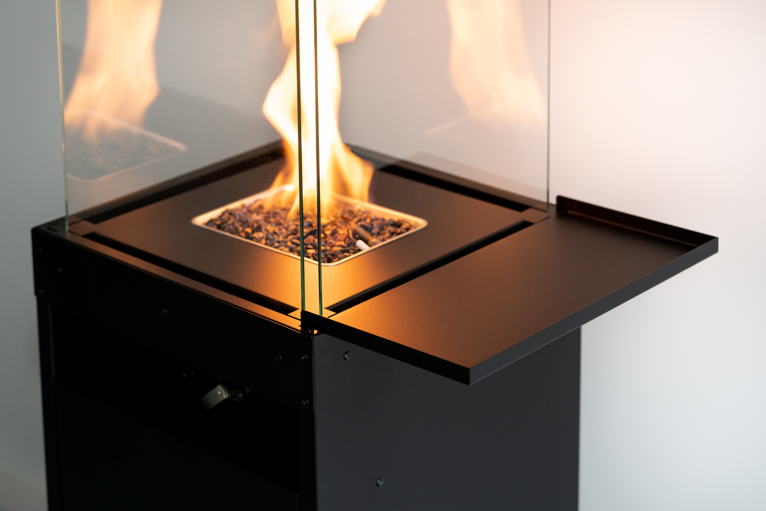 ŁATWY W UŻYCIU Aby włączyć ogrzewacz tarasowy, wystarczy nacisnąć i obrócić pokrętło zgodnie z ruchem wskazówek zegara oraz jednocześnie nacisnąć przycisk zapłonu. Można dalej regulować wysokość płomienia za pomocą pokrętła. |