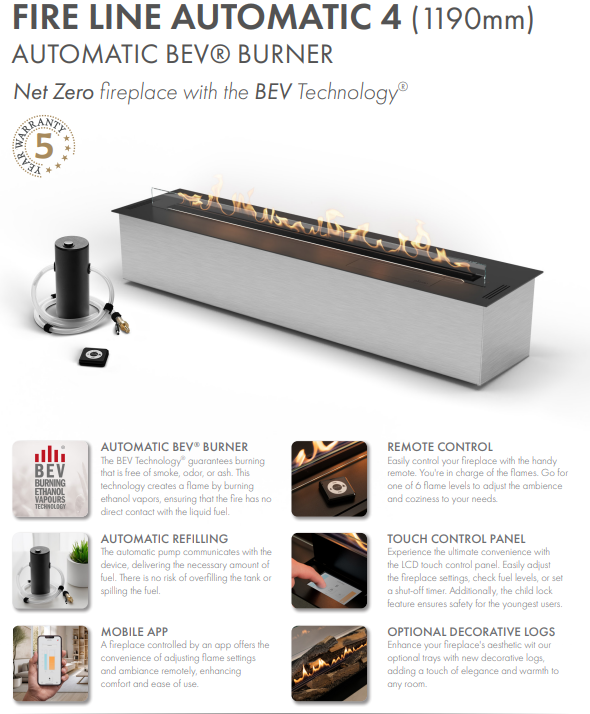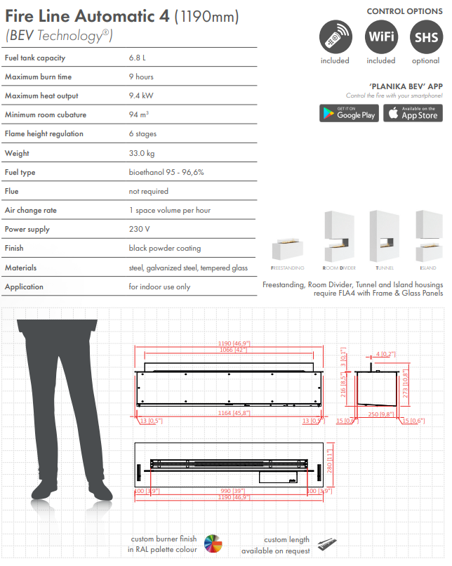 Dzięki pełnej elastyczności projektowej i braku ograniczeń montażowych, FLA4 może być zintegrowany z dowolną przestrzenią – od apartamentów w wieżowcach po luksusowe jachty. Kominek można w pełni dostosować pod względem długości, kształtu i wykończenia – w tym dowolnego koloru z palety RAL – co ułatwia dopasowanie wyglądu i konfiguracji do konkretnego projektu. Produkt objęty jest 5-letnią gwarancją, co zapewnia długotrwały spokój i bezpieczeństwo.