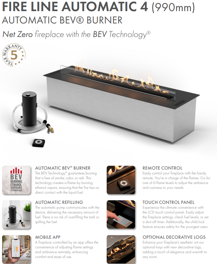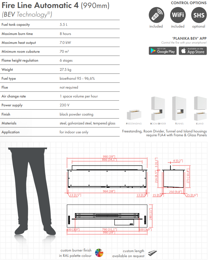 Dzięki pełnej elastyczności projektowej i braku ograniczeń montażowych, FLA4 może być zintegrowany z dowolną przestrzenią – od apartamentów w wieżowcach po luksusowe jachty. Kominek można w pełni dostosować pod względem długości, kształtu i wykończenia – w tym dowolnego koloru z palety RAL – co ułatwia dopasowanie wyglądu i konfiguracji do konkretnego projektu. Produkt objęty jest 5-letnią gwarancją, co zapewnia długotrwały spokój i bezpieczeństwo.
