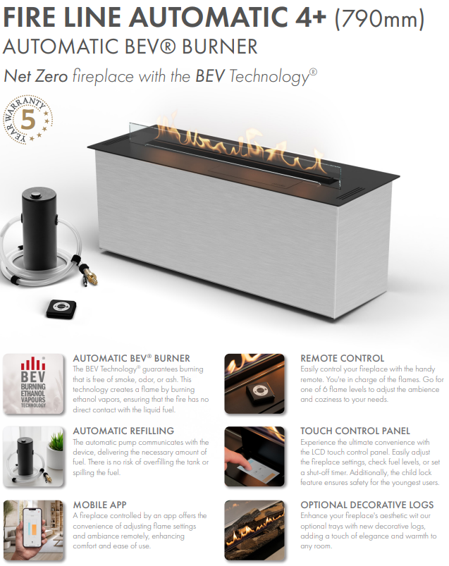 Dzięki pełnej elastyczności projektowej i braku ograniczeń montażowych, FLA4 może być zintegrowany z dowolną przestrzenią – od apartamentów w wieżowcach po luksusowe jachty. Kominek można w pełni dostosować pod względem długości, kształtu i wykończenia – w tym dowolnego koloru z palety RAL – co ułatwia dopasowanie wyglądu i konfiguracji do konkretnego projektu. Produkt objęty jest 5-letnią gwarancją, co zapewnia długotrwały spokój i bezpieczeństwo.
