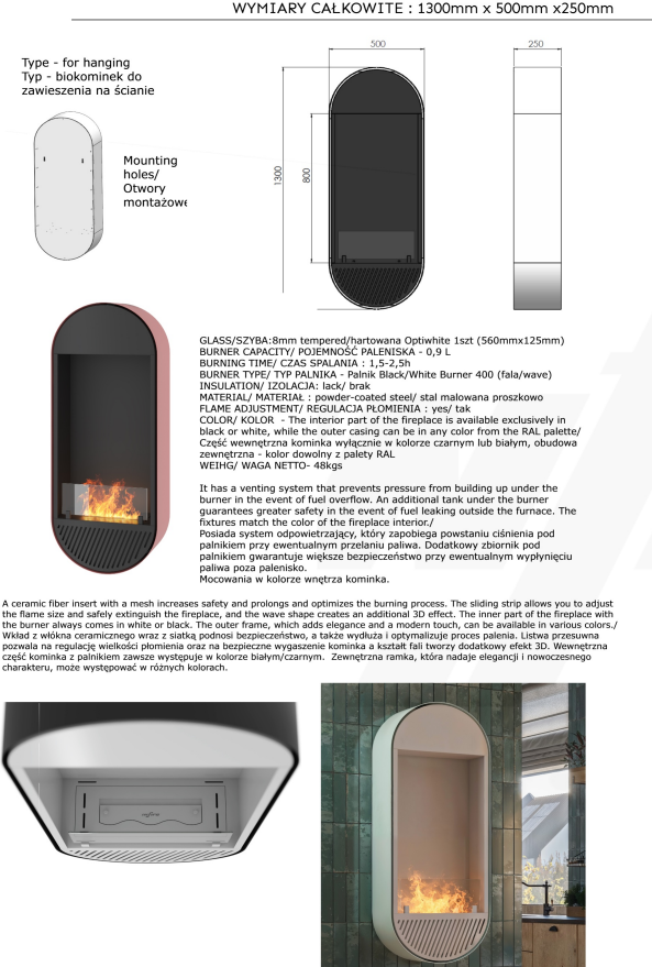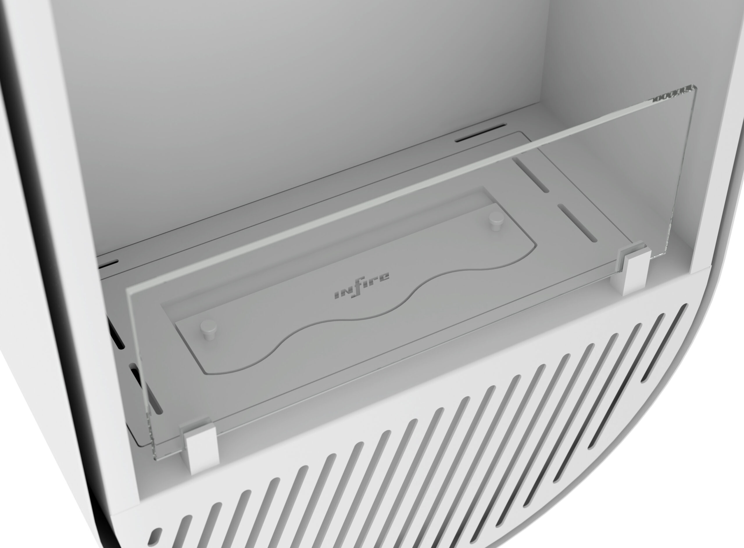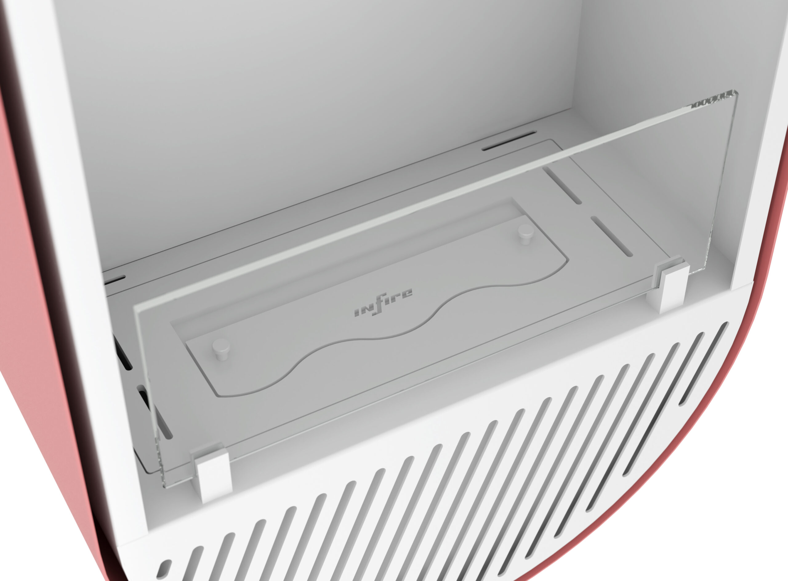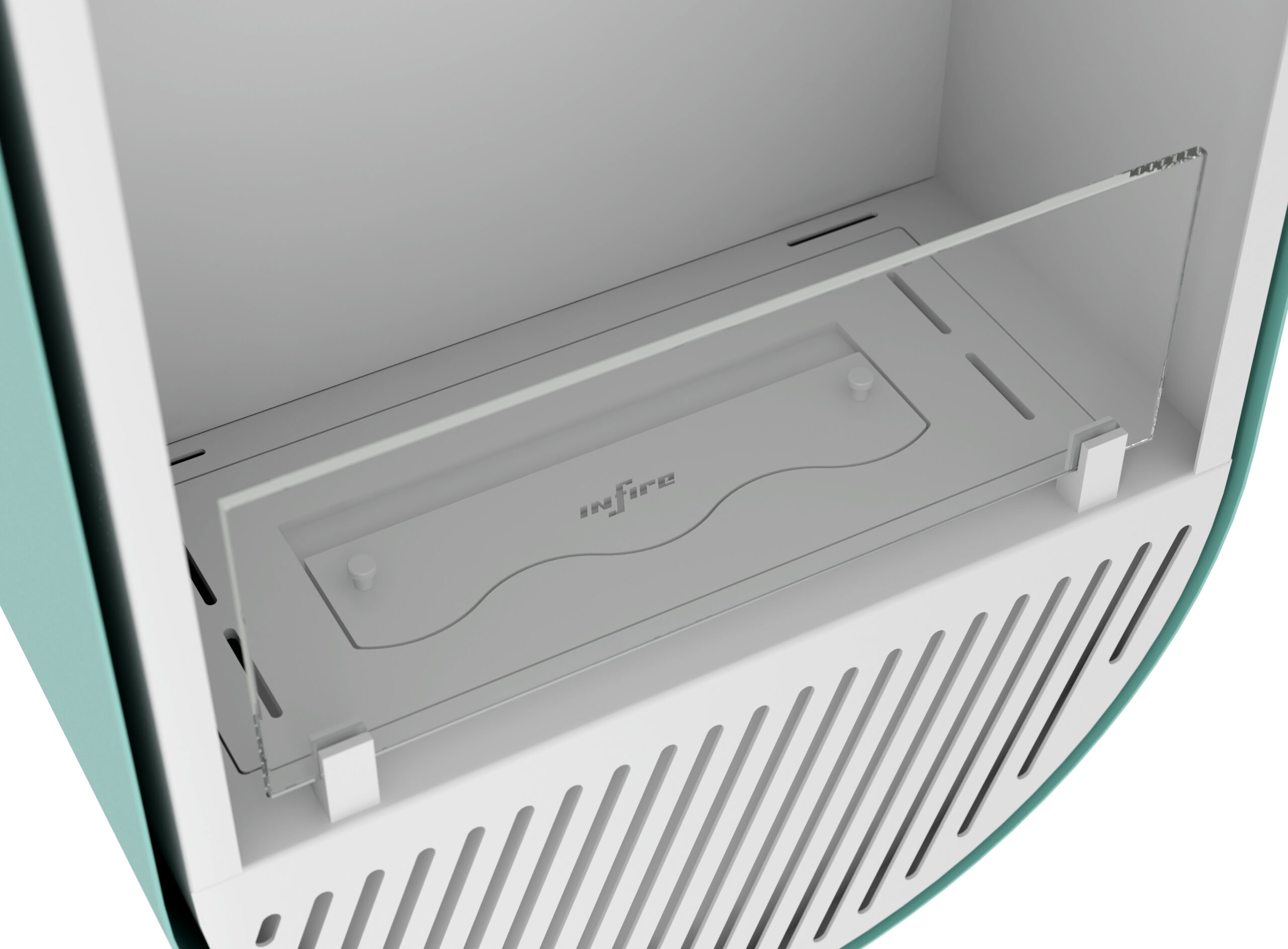 Wkład z włókna ceramicznego wraz z siatką podnosi bezpieczeństwo, a także wydłuża i optymalizuje proces palenia. Listwa przesuwna pozwala na regulację wielkości płomienia oraz na bezpieczne wygaszenie kominka a kształt fali tworzy dodatkowy efekt 3D. Wewnętrzna część kominka z palnikiem zawsze występuje w kolorze białym/czarnym. Zewnętrzna ramka, która nadaje elegancji i nowoczesnego charakteru, może występować w różnych kolorach.