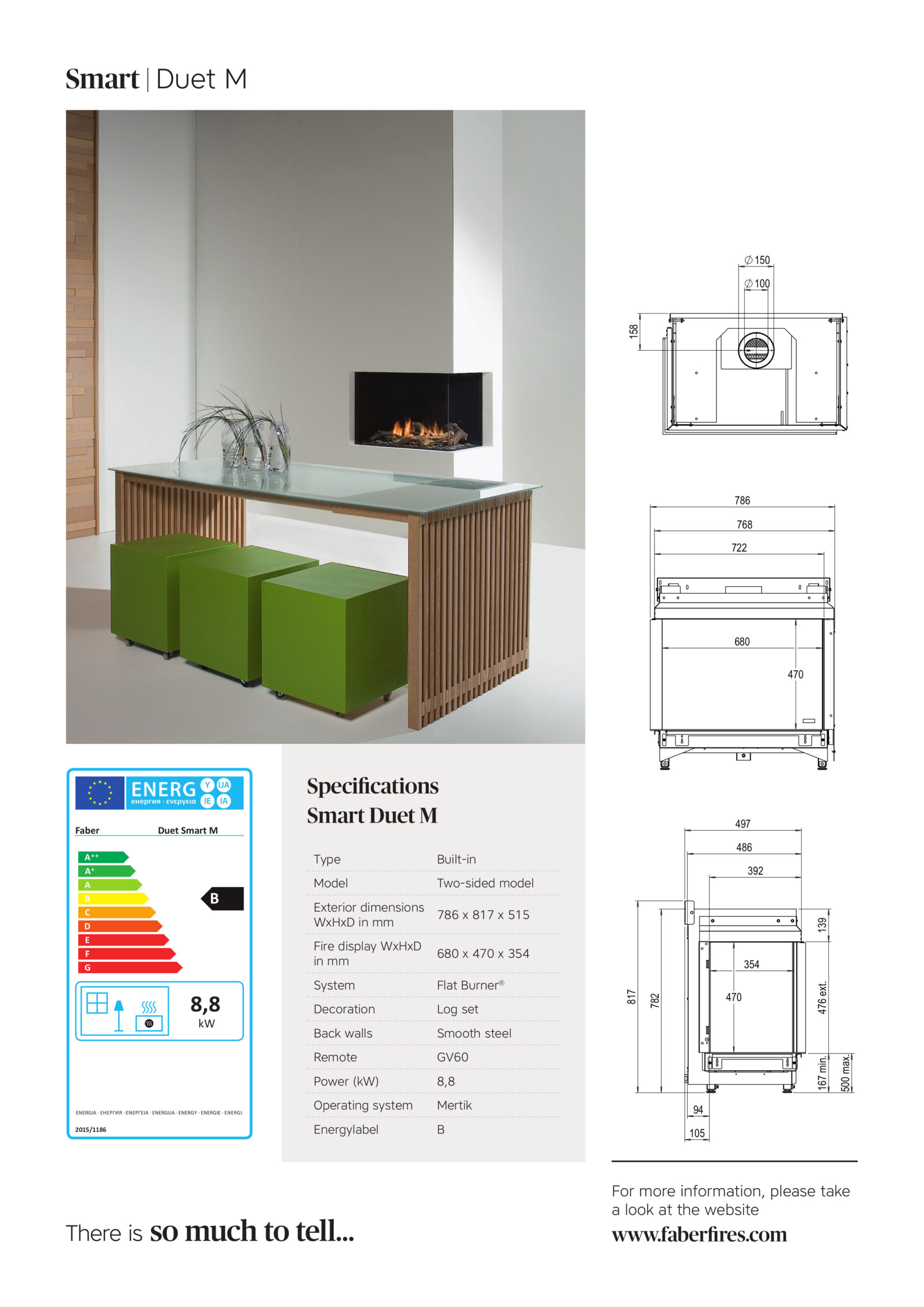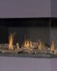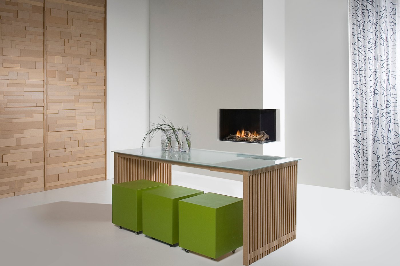 Zastosowane w kominku gazowym DUET M SMART bujne płomienie Flat Burner® bez względu na ich wysokość, okazałe, wypełniają niemalże całą szerokość płyty paleniska. Obraz ten uzupełniają elementy dekoracyjne – poziomo usytuowane, realistycznie wyglądające polana, białe otoczaki Carrara lub szary grys. Pracą kominka można sterować za pomocą pilota zdalnego sterowania.