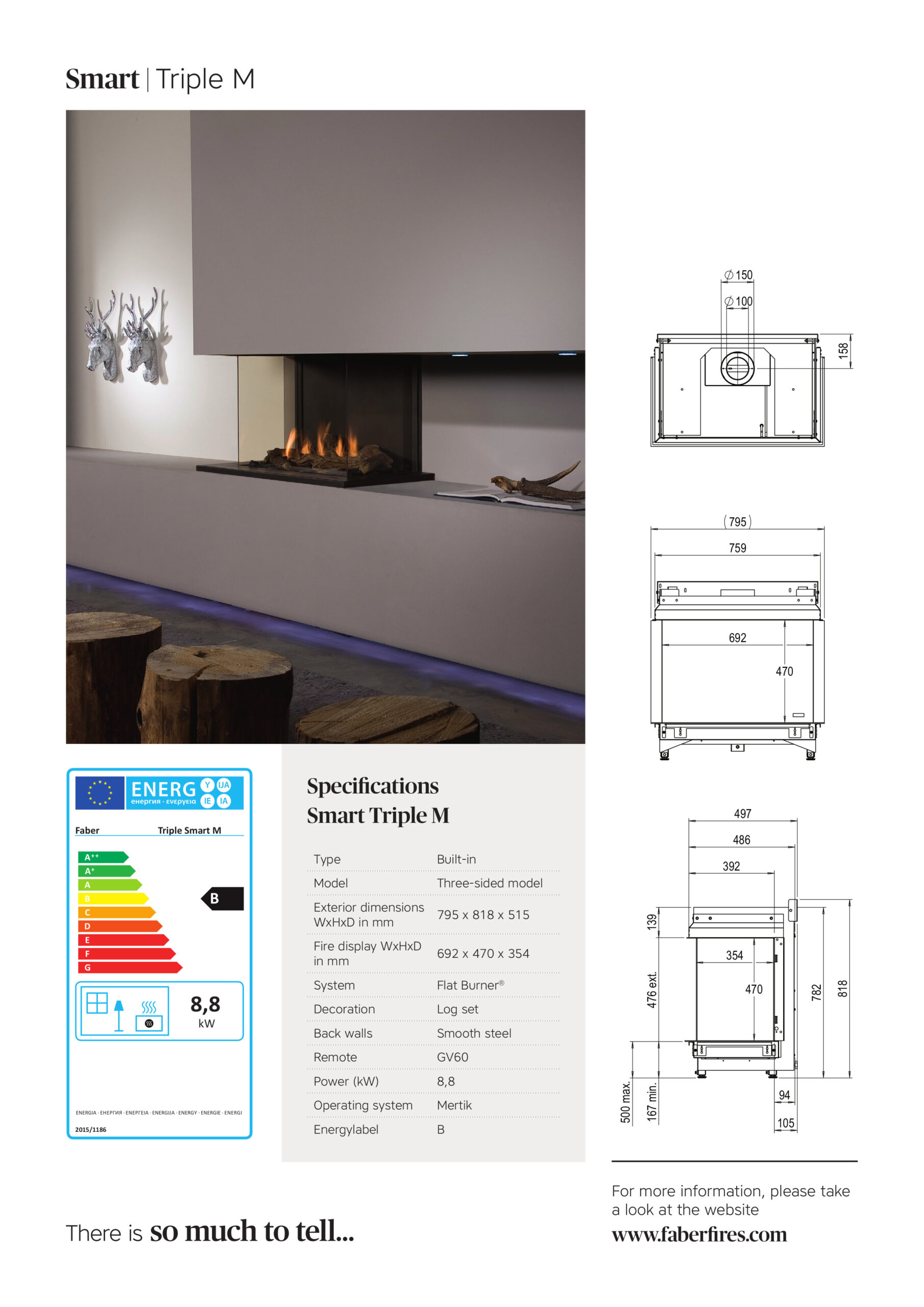 Kominek gazowy do zabudowy TRIPLE M SMART TRÓJSTRONNY, wyposażony w palnik Flat Burner®. Efekt płomienia wytworzony przez Flat Burner® kreuje poziomy obraz ognia, w który można wpatrywać się długimi godzinami. Model ten dostępny jest w dwóch rozmiarach.