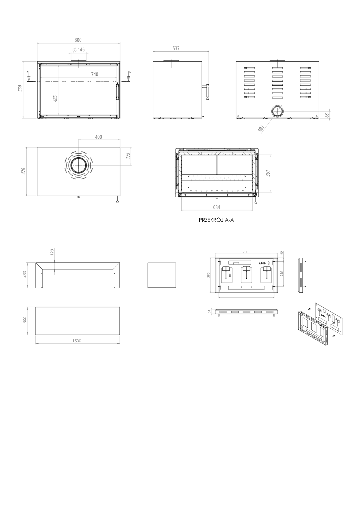 - Wylot spalin montowany od środka komory spalania fi 150 mm pozwala na instalacje w istniejących paleniskach otwartych.