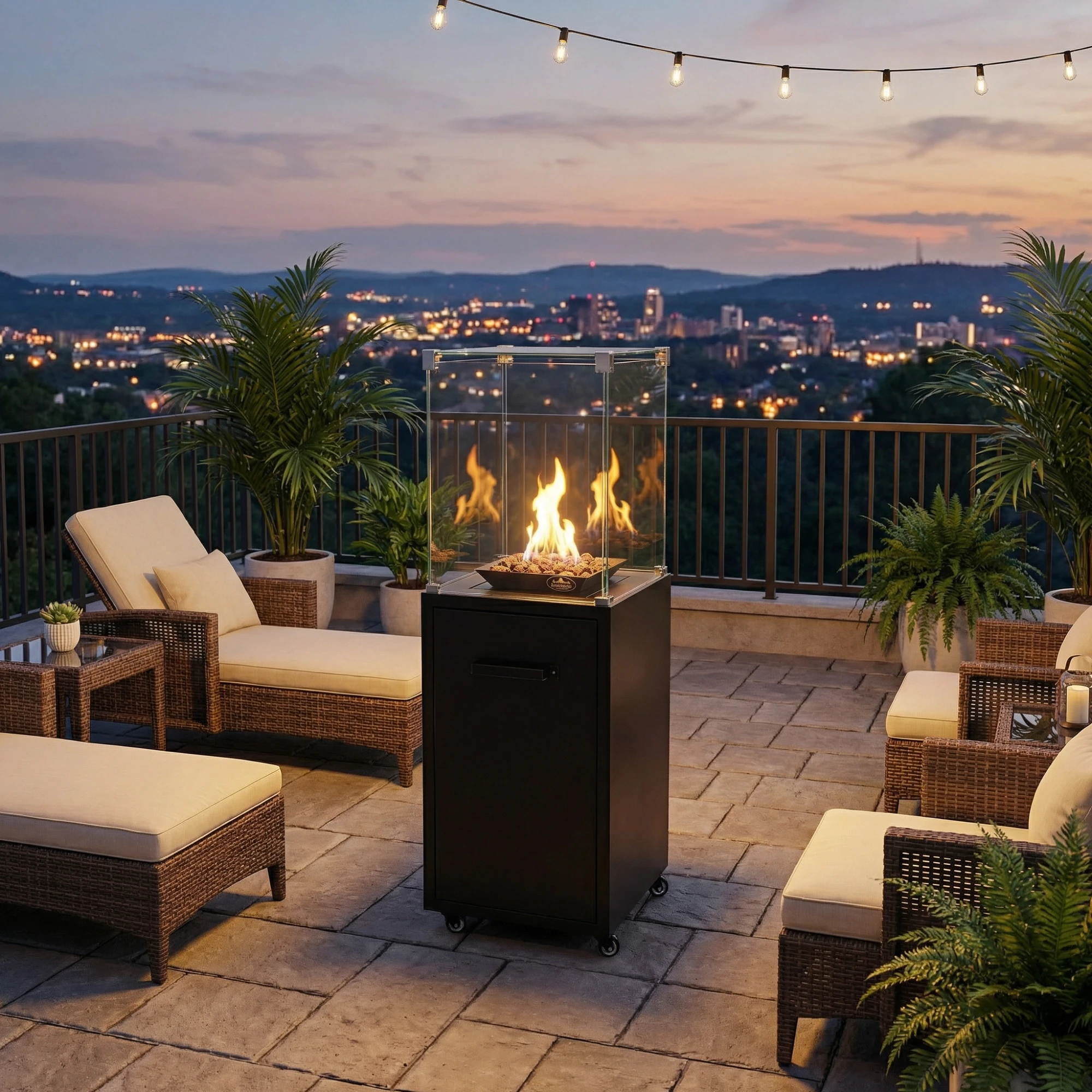 Ogrzewacz Tarasowy Malaga to prosty, kwadratowy kominek gazowy od Muztag oferuje oszałamiające i mocne płomienie, które można podziwiać w 360 stopniach.