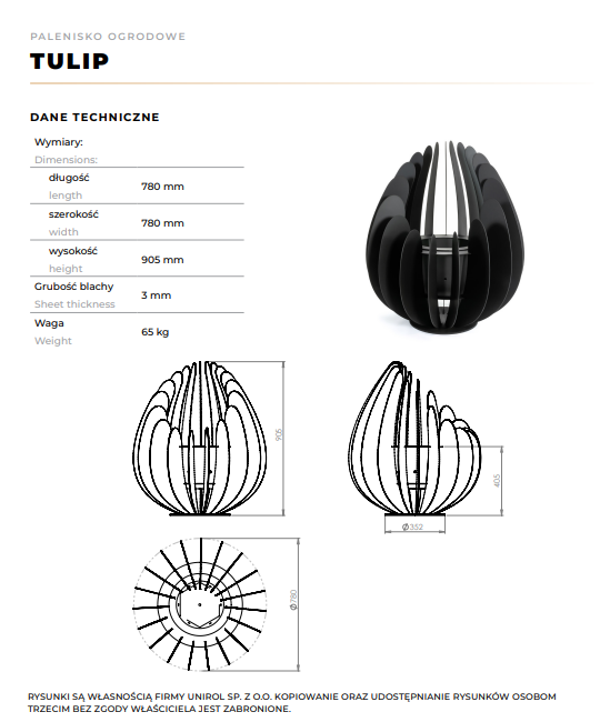 Palenisko ogrodowe Tulip to rozwiązanie dla osób ceniących dobry design oraz wygodę użytkowania. Asymetryczna linia osłania ogień, uzupełniając widok strzelistymi elementami stalowymi, które dzielą obraz tańca płomieni na harmonijne, interwałowe części. Wizualny spektakl, jaki tworzy połączenie formy paleniska, z naturalnym pięknem ognia, zapewni widowiskowy element dekoracyjny. Piękno tulipanów zainspirowało projektantów do stworzenia posągowej sylwetki paleniska Tulip, które stanowi gratkę dla miłośników nieoczywistych kształtów i inspirujących form.