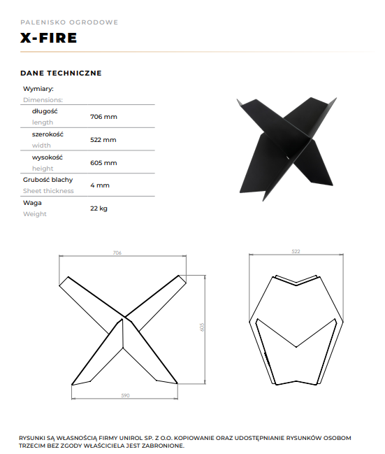 Palenisko zewnętrzne X-Fire to rozwiązanie dla osób ceniących dobry design oraz wygodę użytkowania. Palenisko składa się z dwóch elementów wykonanych z solidnej, 4 milimetrowej blachy. Ich montaż, jak i demontaż jest wyjątkowo prosty – wystarczy wsunąć jeden element w drugi. Ta operacja trwa zaledwie kilka sekund. Same elementy po rozłożeniu zajmują minimalną ilość miejsca, dzięki czemu są idealne do przechowywania po zakończeniu sezonu, czy zabierania paleniska na wyjazdy