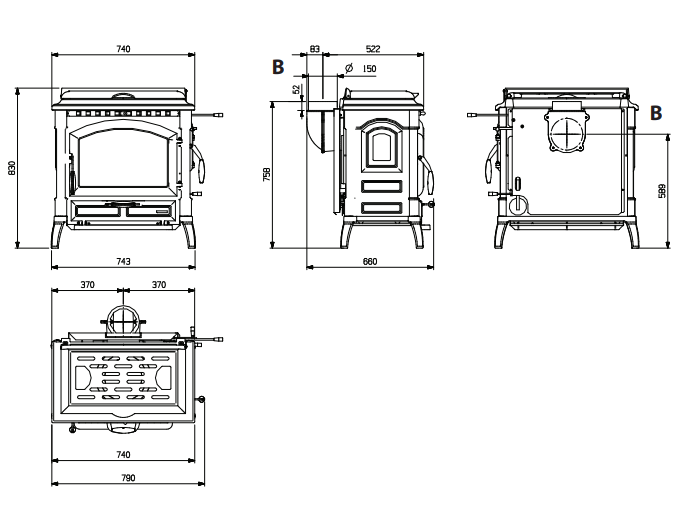 Palenisko jest wewnętrznie wyłożone pojedynczymi płytami żeliwnymi, część tylna jest wyjmowana. Dzięki zastosowaniu skalibrowanych otworów, zapewniony jest dopływ podgrzanego powietrza do wnętrza paleniska, uzyskując w ten sposób dodatkowe spalanie, które zwiększa wydajność i ogranicza emisję niespalonych gazów. Wewnątrz znajduje się zdejmowana obrotowa kratka.