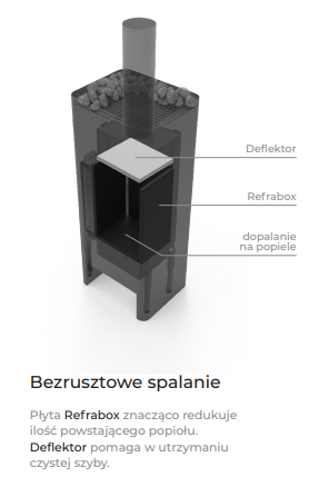 - Czysta szyba. W kominku zastosowano autorski system obiegu powietrza. Czyste powietrze spływa poprzez otwory nad drzwiczkami, tworząc naturalne korytarze powietrzne, chroniące szybę przed osadami ze spalania.