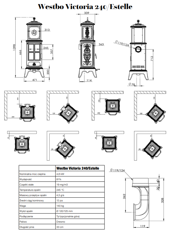 Najnowszy piecyk z rodziny Victoria to Victoria 240 (zwany również Westbo Estelle). Piec wyposażony w komorę akumulacyjną utrzymująca ciepło oraz płytę grzewczą. Dzięki temu doskonale nadaje się na miłe zimowe wieczory, na przykład z ciepłymi racuchami świeżo zdjętymi z płyty grzewczej. Piecyk został zaprojektowany według starych modeli, ozdobiony pięknymi secesyjnymi ornamentami. To typowy żeliwny piec manufaktury Westbo.