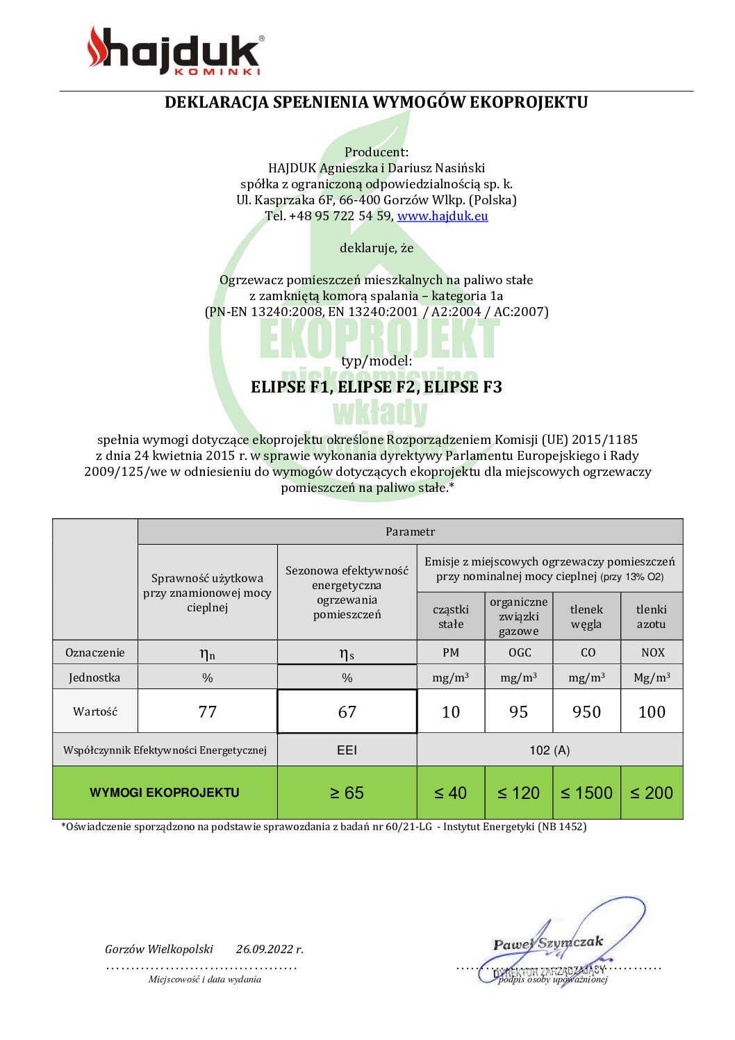 Hajduk oferuje piece typu koza, które spełniają surowe normy europejskie. ELIPSE F3A osiąga wysoką sprawność energetyczną, dzięki czemu zużywa mniejsze ilości paliwa. Ponadto zastosowane rozwiązania i systemy znacząco redukują emisję szkodliwych substancji do atmosfery.