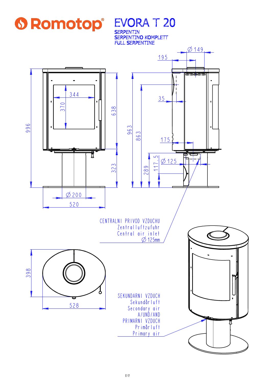 Piec kominkowy odpowiedni do domów energooszczędnych. Piec posiada system CDP – centralne doprowadzenie powietrza zewnętrznego. Standardowo możliwe jest podłączenie górnego lub tylnego odprowadzenia spalin. Dzięki dopływowi powietrza wtórnego, które opływa szybę drzwiczek, nie dochodzi do osadzania zabrudzeń. Komora spalania wyłożona szamotem. Regulacja dopływu powietrza pierwotnego i wtórnego za pomocą jednego elementu sterującego.