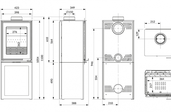 - Dolot powietrza z zewnątrz – Wolnostojący piec przystosowany do doprowadzenia powietrza z zewnątrz (∅80) — z możliwością podłączenia od tyłu lub od dołu.