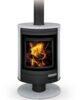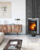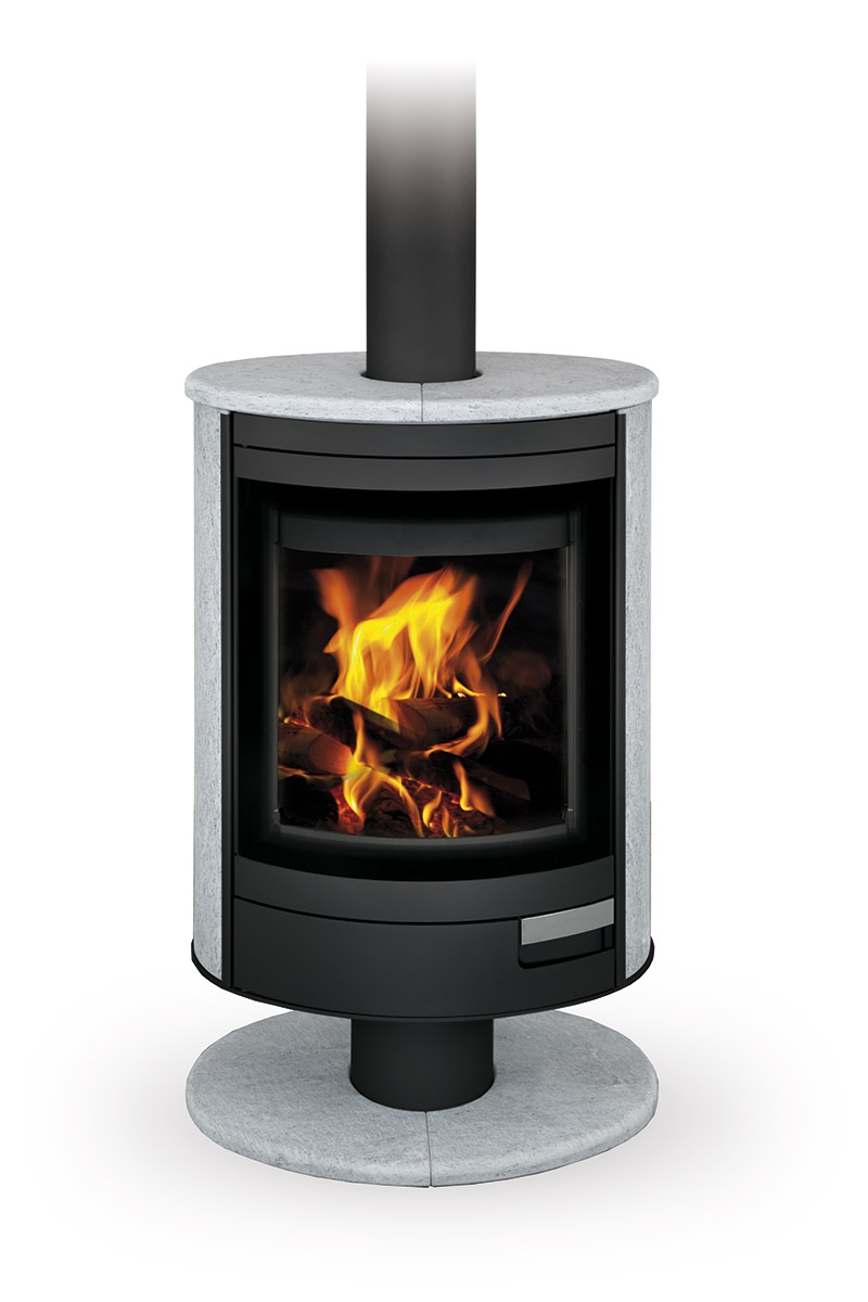Obrotowe palenisko zapewnia użytkownikowi widok ognia pod różnym kątem. Wzornictwo wzmacniają w całości szklane drzwiczki pieca.