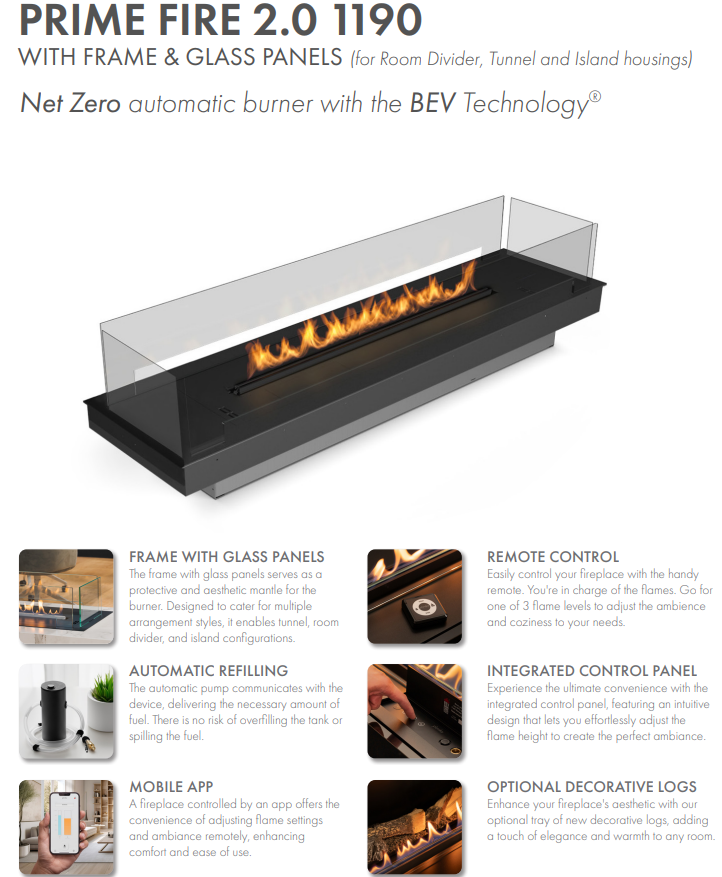 Palnik Prime Fire 2.0 1190 to najbezpieczniejszy kominek etanolowy na rynku – oferuje w pełni zdalną obsługę, inteligentne funkcje oraz automatyczny system uzupełniania paliwa.