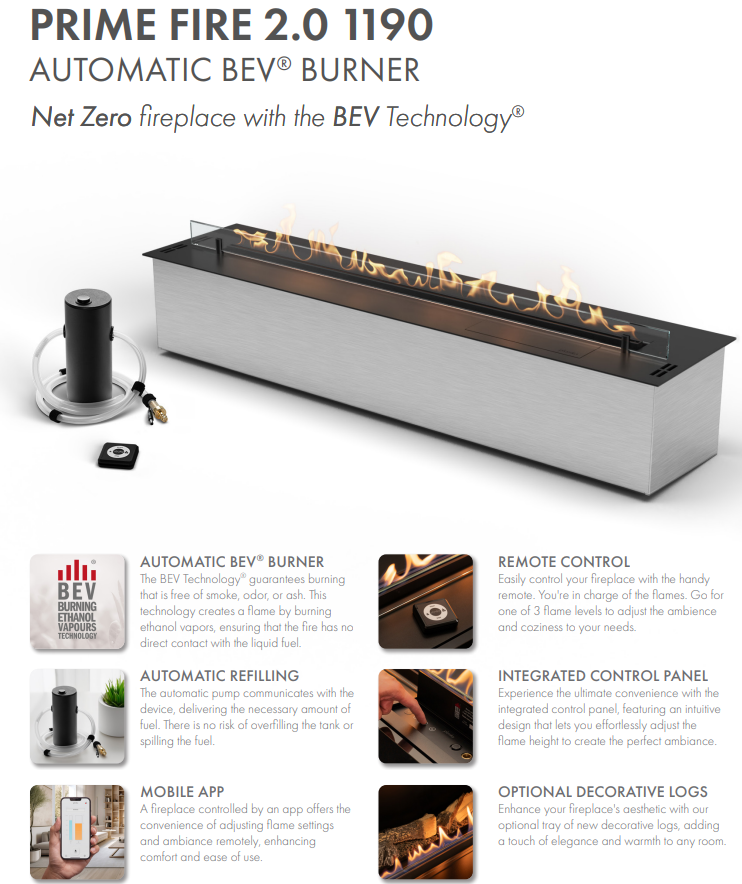 Palnik Prime Fire 2.0 1190 to najbezpieczniejszy kominek etanolowy na rynku – oferuje w pełni zdalną obsługę, inteligentne funkcje oraz automatyczny system uzupełniania paliwa.