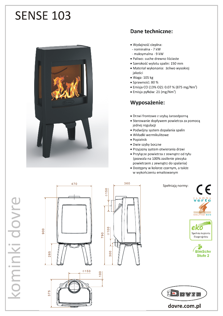 - Podłączenie do przewodu kominowego: fi 150 (od góry lub od tyłu);
