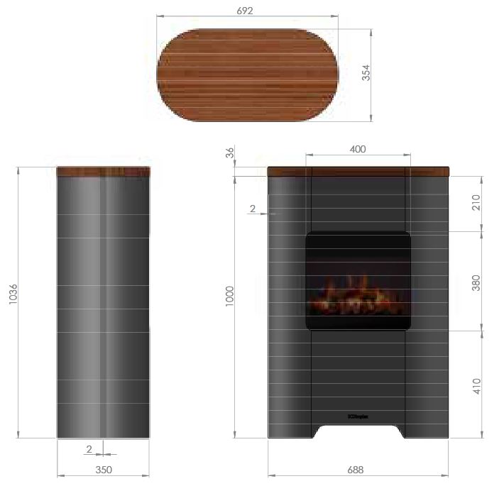 Owalna obudowa kominka Torn 100 wykonana została z wysokiej jakości stali o niejednolitej fakturze. Jej górną część ozdabia element imitujący drewno w kolorze czarnym. Torn 100 wyposażony jest w cichą jednostkę grzewczą, która daje przytulne uczucie ciepła. Poczuj moc esencji ognia.