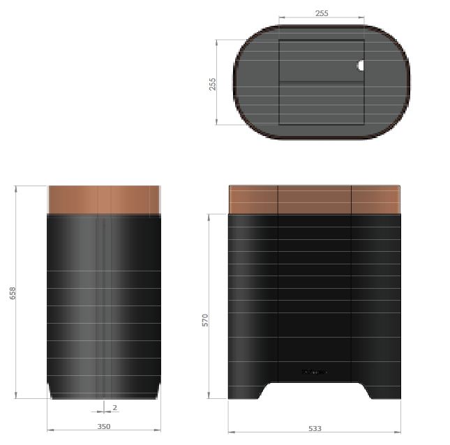 Owalna obudowa kominka Torn 64 wykonana została z wysokiej jakości stali o niejednolitej fakturze. Jej górną część zdobi przejrzysta osłonka otaczająca otwarte palenisko. Poczuj moc esencji ognia.