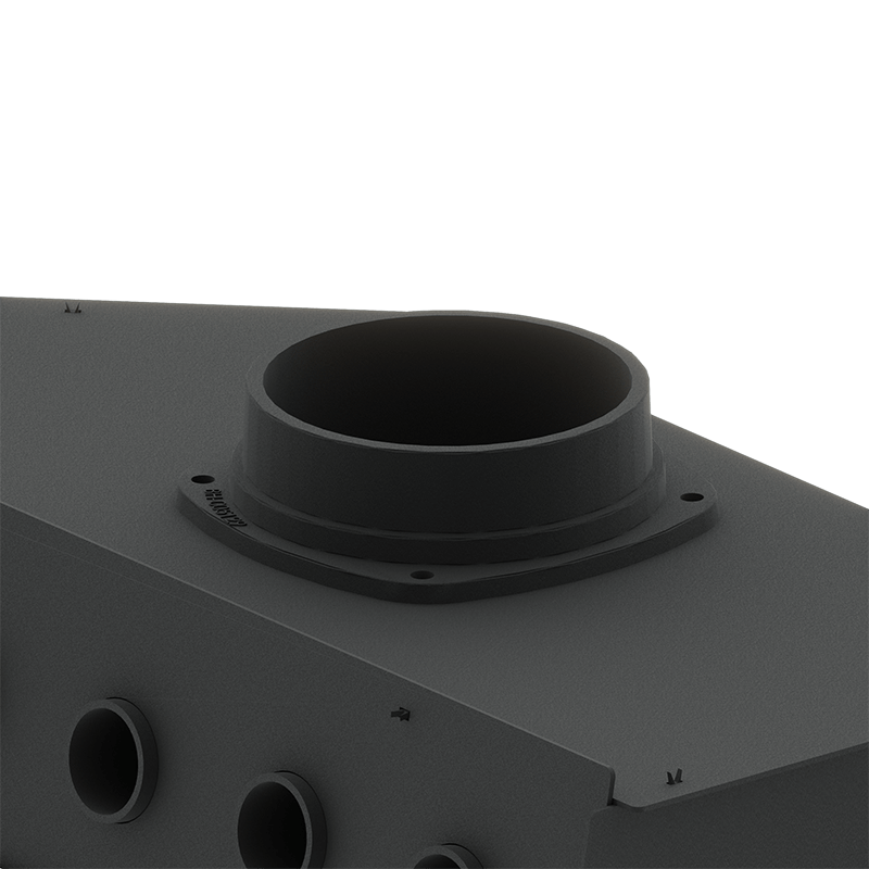 - Specjalnie zaprojektowana tylna część korpusu umożliwia doprowadzenie powietrza wtórnego do górnej części paleniska. Umożliwia podniesienie sprawności urządzenia poprzez dopalanie spalin.
