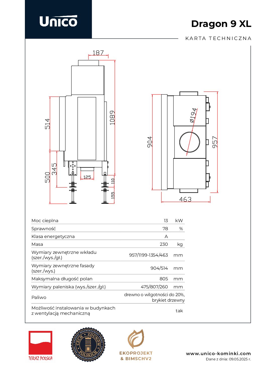 - Wymiary zewnętrzne fasady (szer./wys.) 904/514 mm