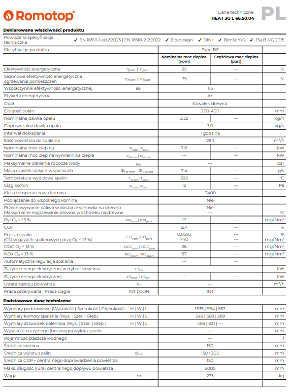 - Wymiary komory spalania (Wys. | Szer. | Głęb.) – 546 | 568 | 289 mm