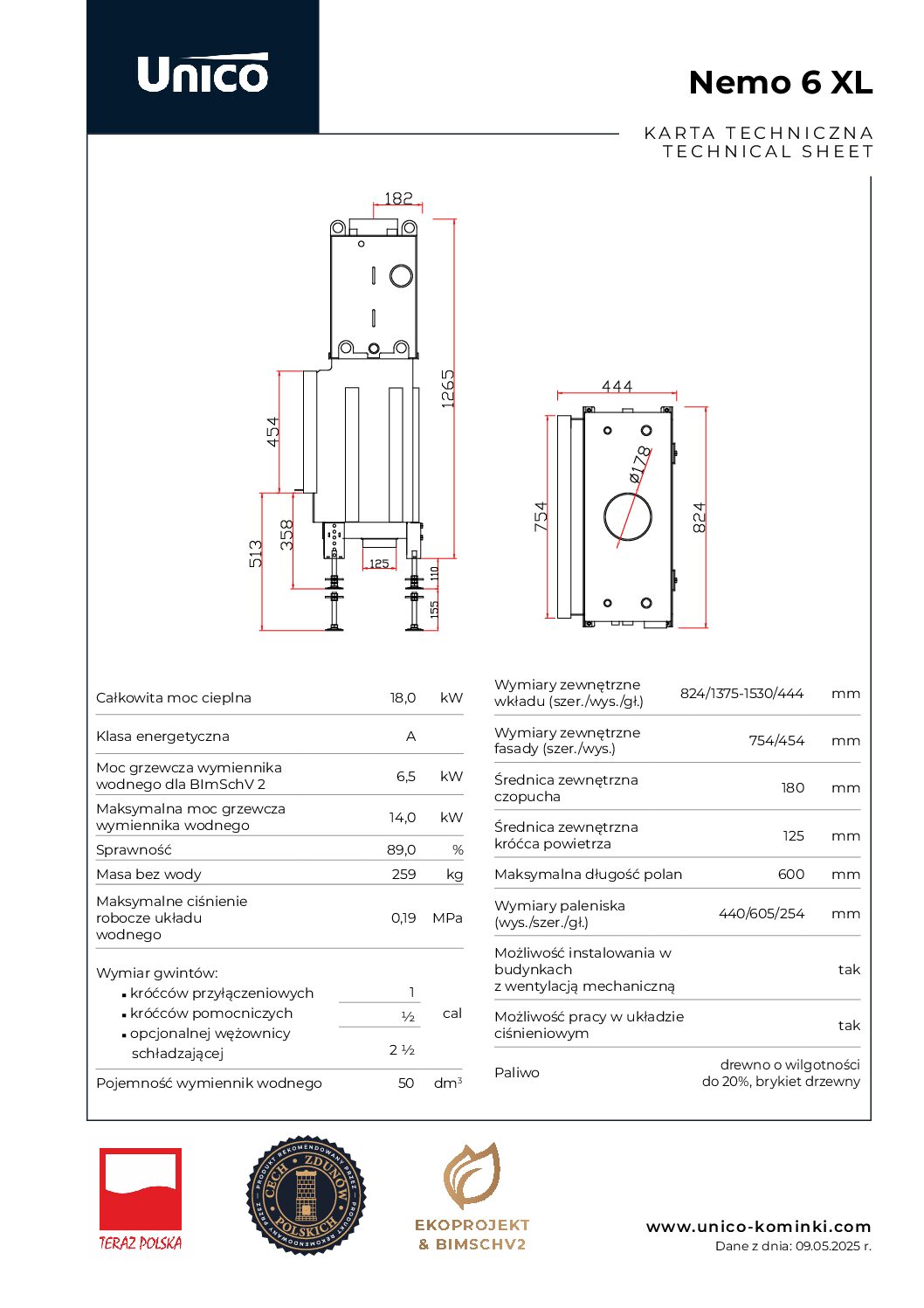 Wymiary zewnętrzne wkładu (szer./wys./gł.) – 824/1375-1530/444 mm