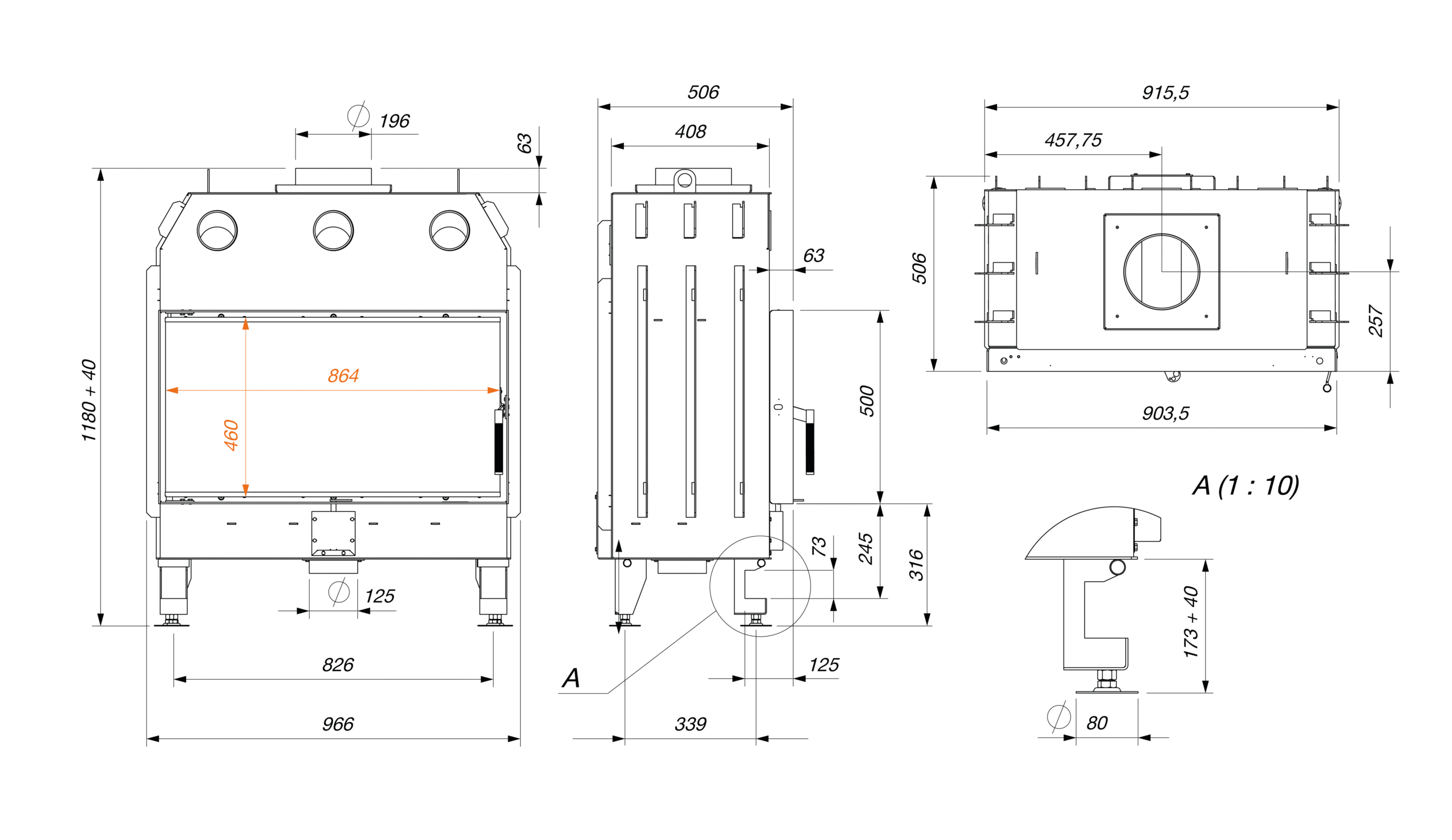 - Doprowadzenie powietrza z zewnątrz (możliwość podłączenia dopływu powietrza od tyłu lub od dołu wkładu kominkowego)