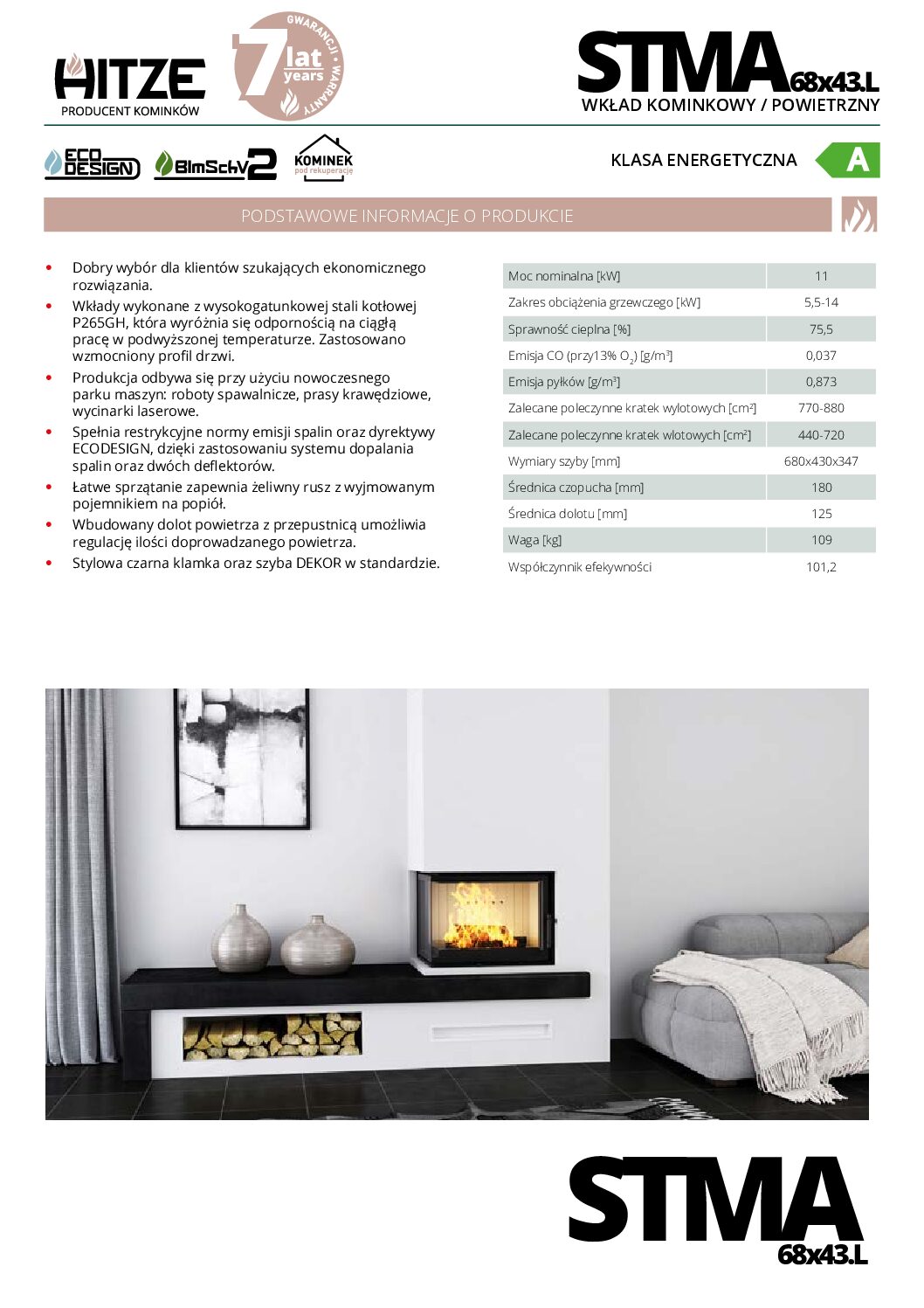 Wkład kominkowy STMA 68×43.L jest przystosowany do współpracy z systemami rekuperacji, co pozwala na efektywne wykorzystanie energii. Wyposażony w żaroodporne szkło ceramiczne, które wytrzymuje temperatury do 800°C, zapewnia bezpieczne i wydajne spalanie. W standardzie kominek posiada stalową podstawę z przepustnicą dolotu zimnego powietrza zewnętrznego, co zwiększa komfort użytkowania i oszczędność energii.
