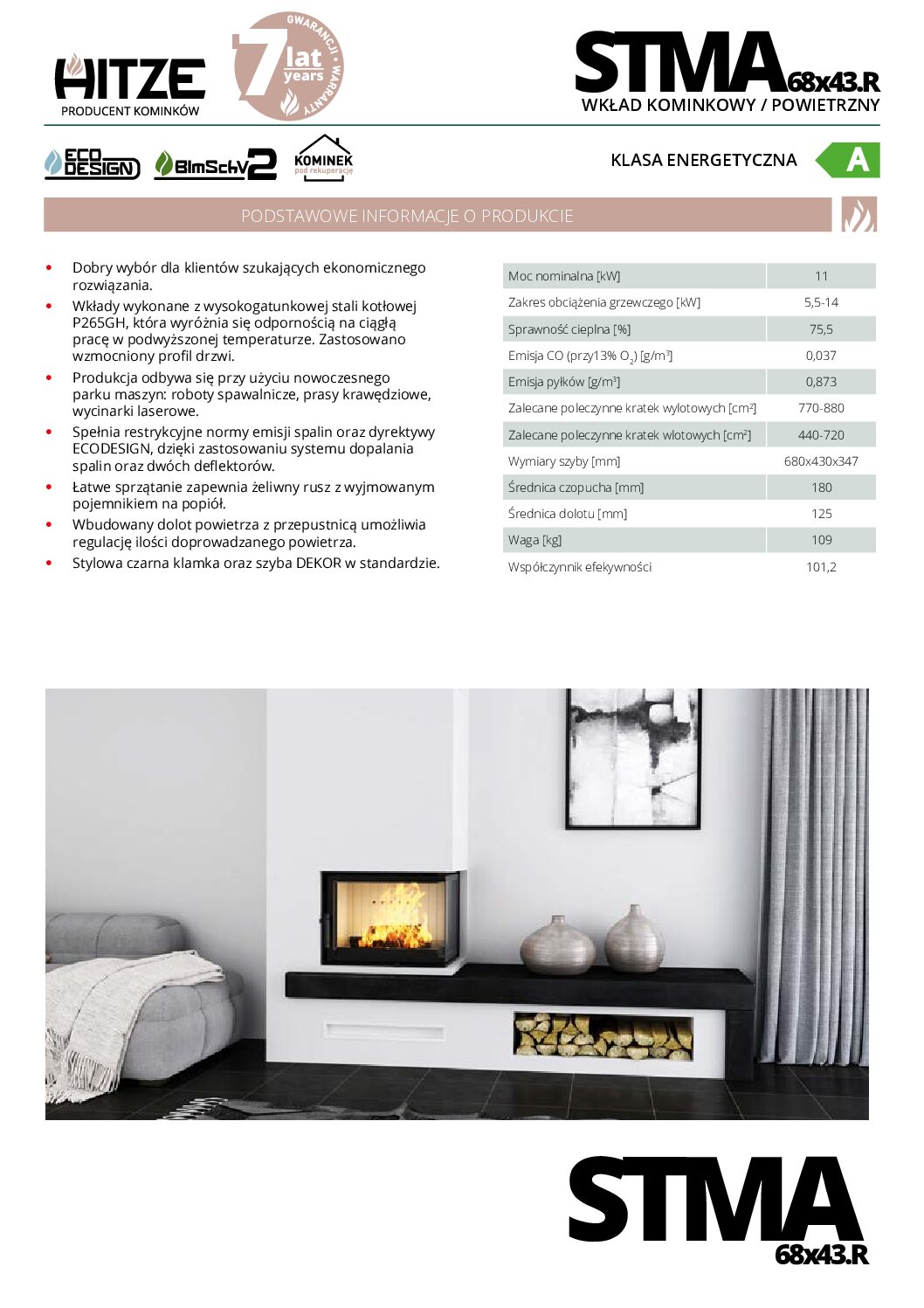 Wkład kominkowy STMA 68×43.R jest przystosowany do współpracy z systemami rekuperacji, co pozwala na efektywne wykorzystanie energii. Wyposażony w żaroodporne szkło ceramiczne, które wytrzymuje temperatury do 800°C, zapewnia bezpieczne i wydajne spalanie. W standardzie kominek posiada stalową podstawę z przepustnicą dolotu zimnego powietrza zewnętrznego, co zwiększa komfort użytkowania i oszczędność energii.