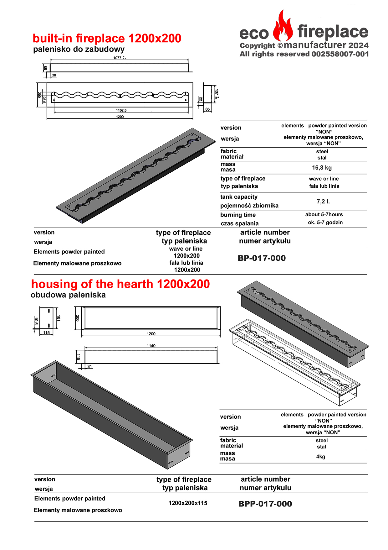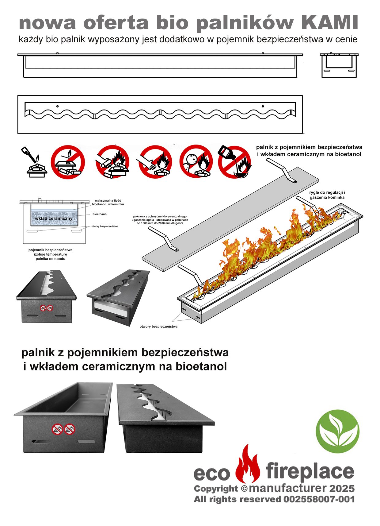 Pojemnik na wkład na biopaliwo 200×1200 jest dodatkowa barierą, która zapobiega przed przypadkowym wydostaniem się płynu z wnętrza wkładu (np. podczas napełniania go bioetanolem) i w ten sposób eliminuje możliwość wystąpienia zagrożenia niekontrolowanym zapłonem oparów biopaliwa. Dzięki otworom w ściankach dodatkowego pojemnika palne opary bioetanolu wydostaną się i swobodnie ulotnią nie powodując żadnej szkody.