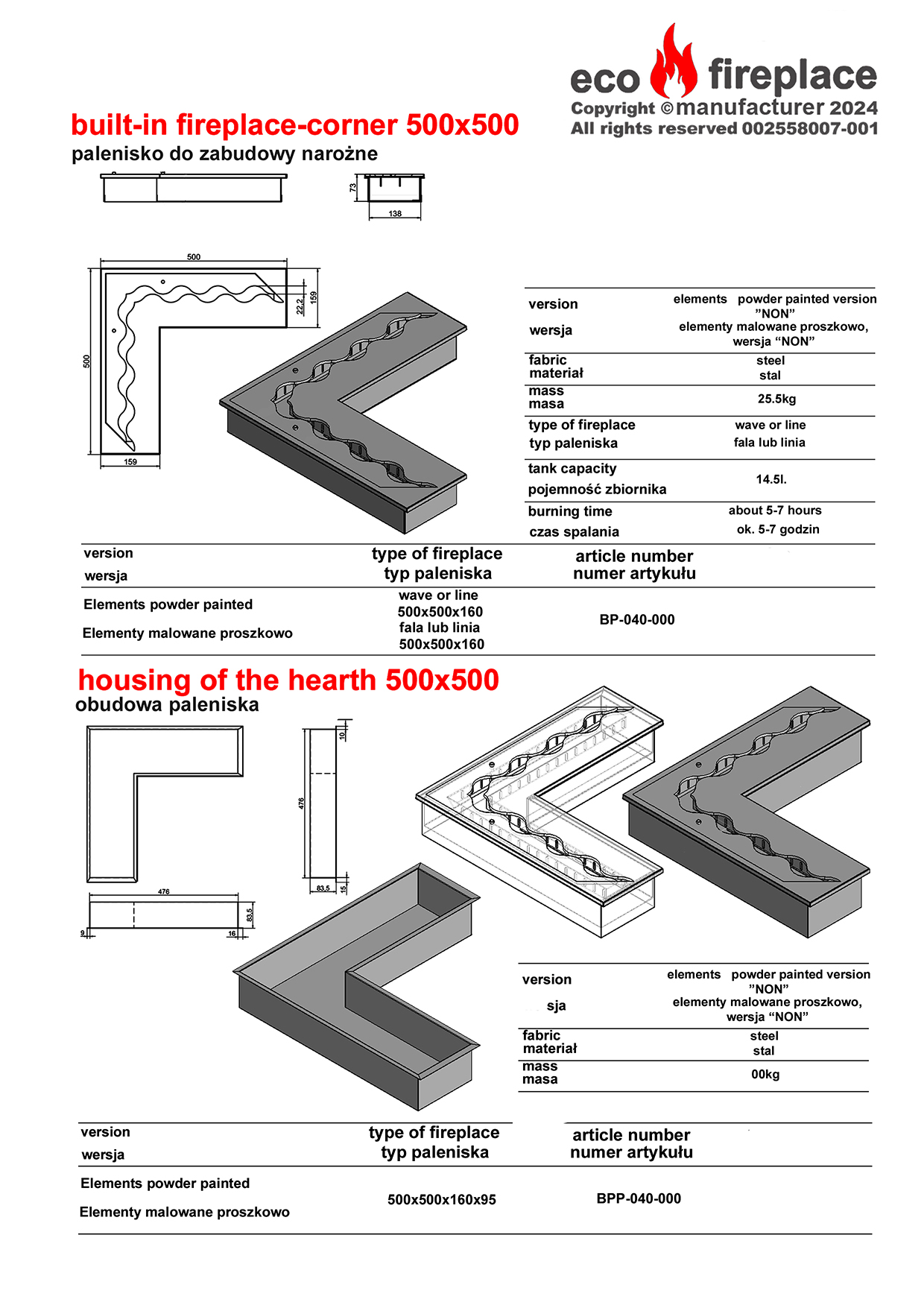 Wkład na biopaliwo do biokominka (korpus) wykonany jest z wysokogatunkowej stali o grubości 1,5 mm, malowanej proszkowo farbą termoodporną na kolor czarny (półmat). Natomiast składająca się z dwóch części pokrywa wkładu – to precyzyjnie wycięty laserowo element z blachy o grubości aż 5 mm. Oferujemy dwa rodzaje pokrywy: stal zabezpieczona tą samą co korpus czarną farbą termoodporną lub stal nierdzewna (inox). Pokrywa tej grubości jest odporna na wszelkie odkształcenia powodowane przez działanie wysokiej temperatury i zachowuje swój pierwotny kształt. Idealne spasowanie krawędzi pokrywy gwarantuje precyzję regulacji wielkości płomienia, jak również szybkie i łatwe jego wygaszenie.