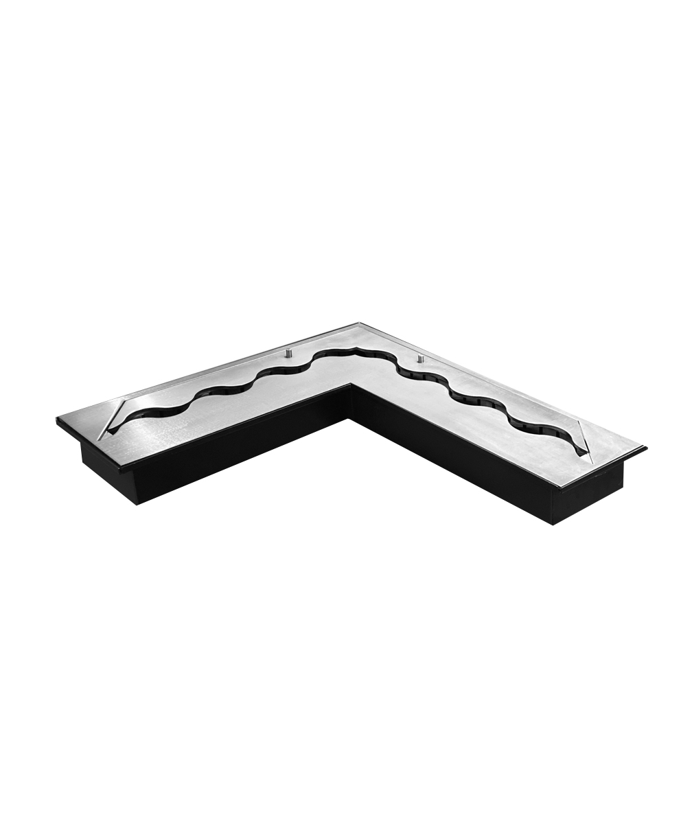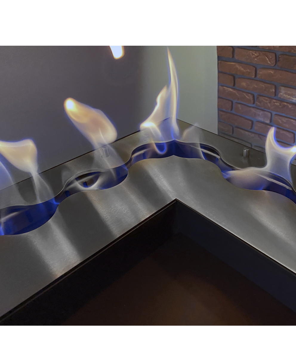 Nowoczesny wkład do biokominka Narożny Fala 500×500 o charakterystycznej, nowatorskiej linii ognia w kształcie fali, która sprawia, że płomień staje się bardziej dynamiczny i przestrzenny.