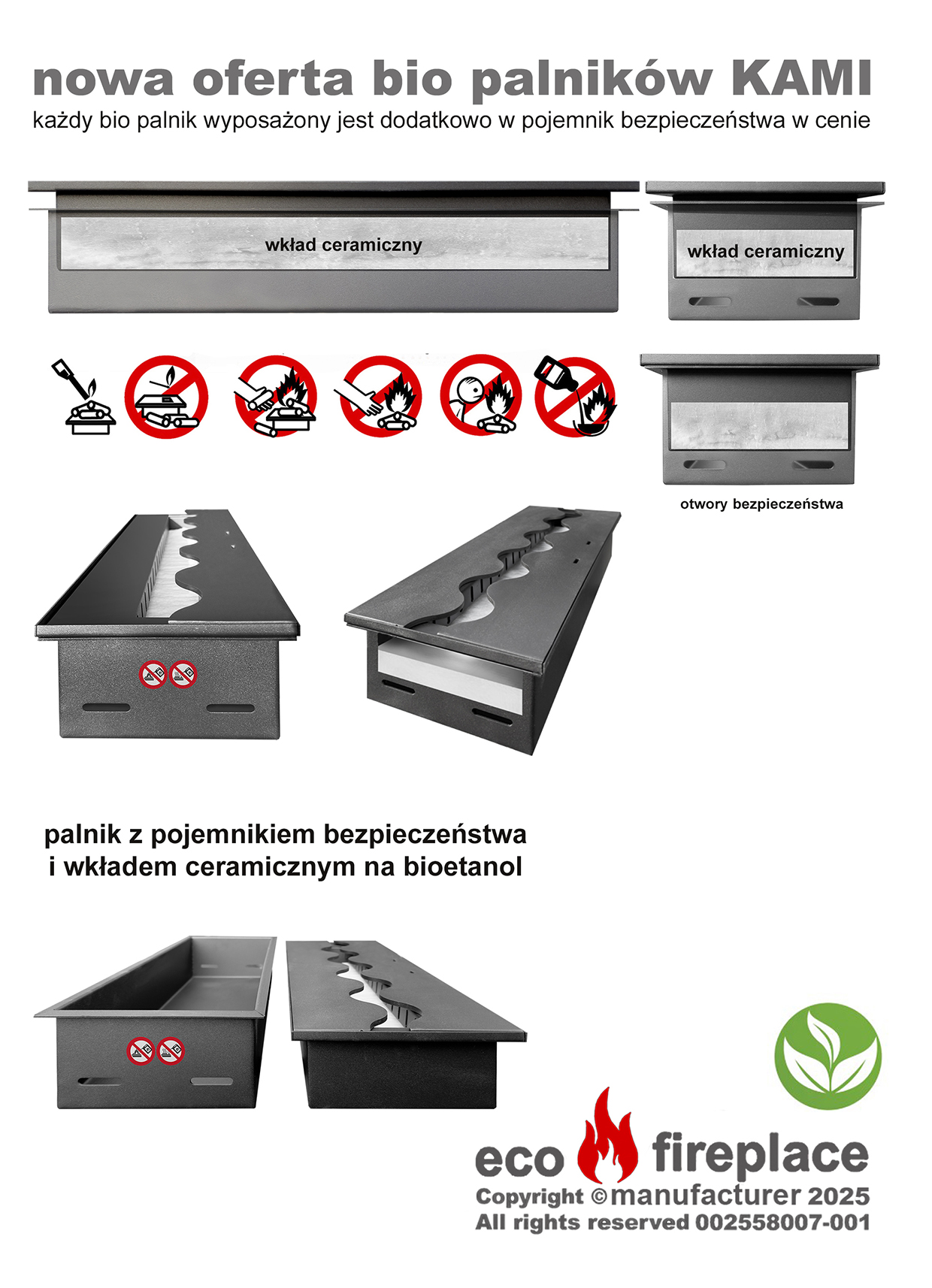 Pojemnik na wkład na biopaliwo 500×500 jest dodatkowa barierą, która zapobiega przed przypadkowym wydostaniem się płynu z wnętrza wkładu (np. podczas napełniania go bioetanolem) i w ten sposób eliminuje możliwość wystąpienia zagrożenia niekontrolowanym zapłonem oparów biopaliwa. Dzięki otworom w ściankach dodatkowego pojemnika palne opary bioetanolu wydostaną się i swobodnie ulotnią nie powodując żadnej szkody.
